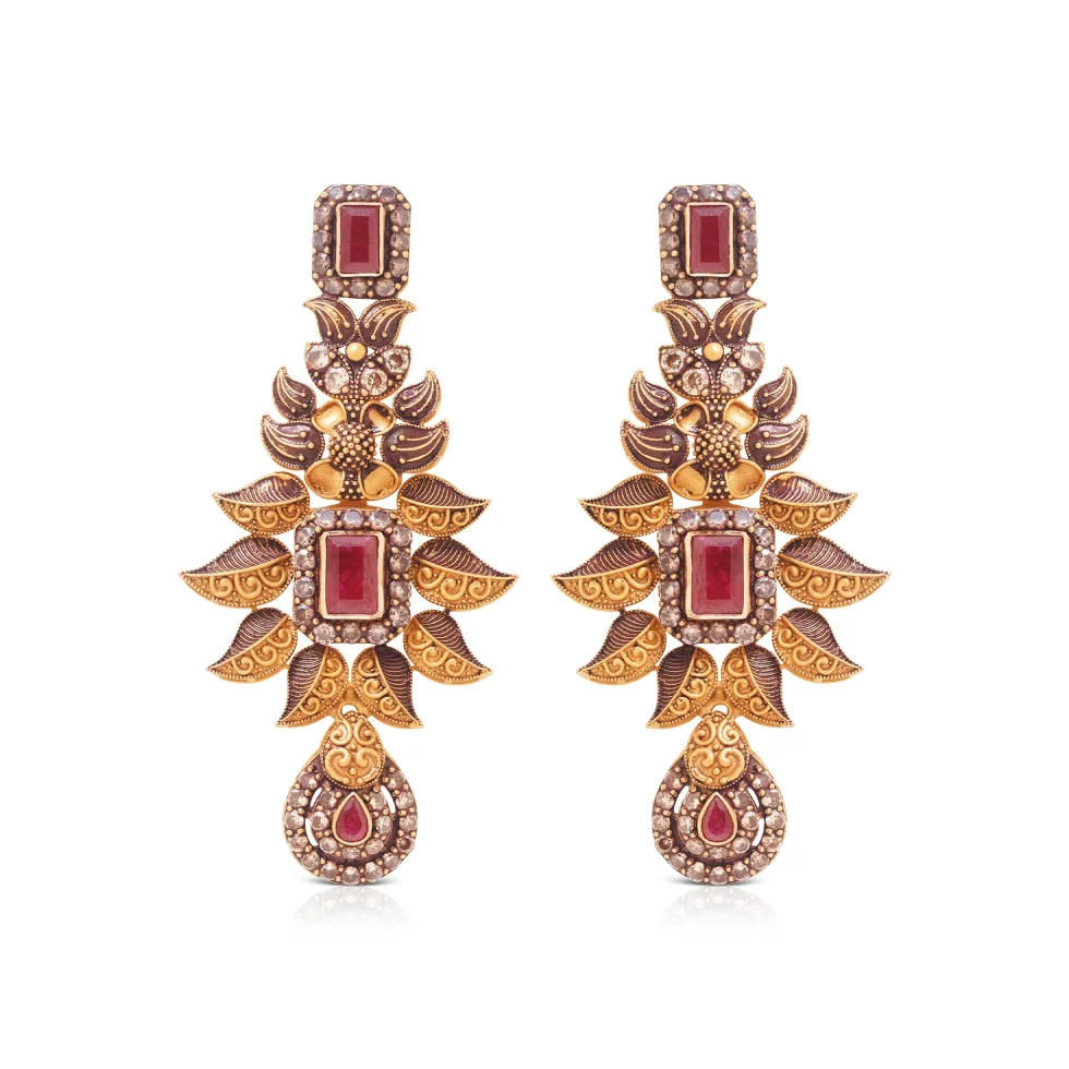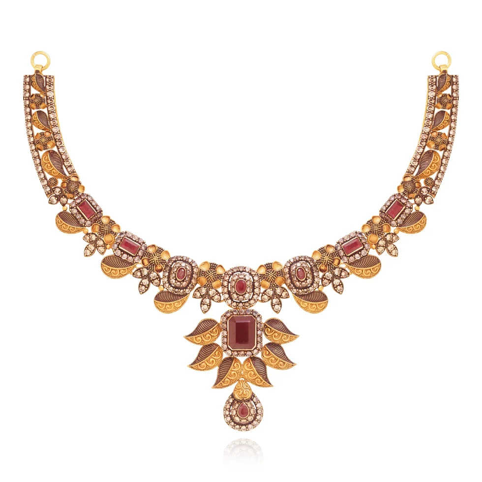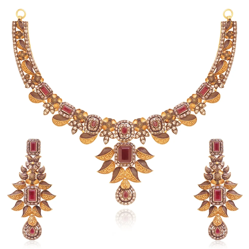 A celebration of heritage design, this necklace set blends layered foliage motifs with rich red gemstone centers. Its graceful contours and elegant drops make it a piece to be cherished across generations.