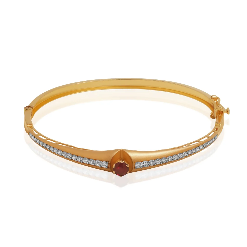 The Ruby Line Kara presents a sleek gold band enriched with a vivid ruby centerpiece and linear diamond detailing. Its clean structure and balanced proportions deliver a modern yet classic appeal, ideal for those who prefer understated luxury.