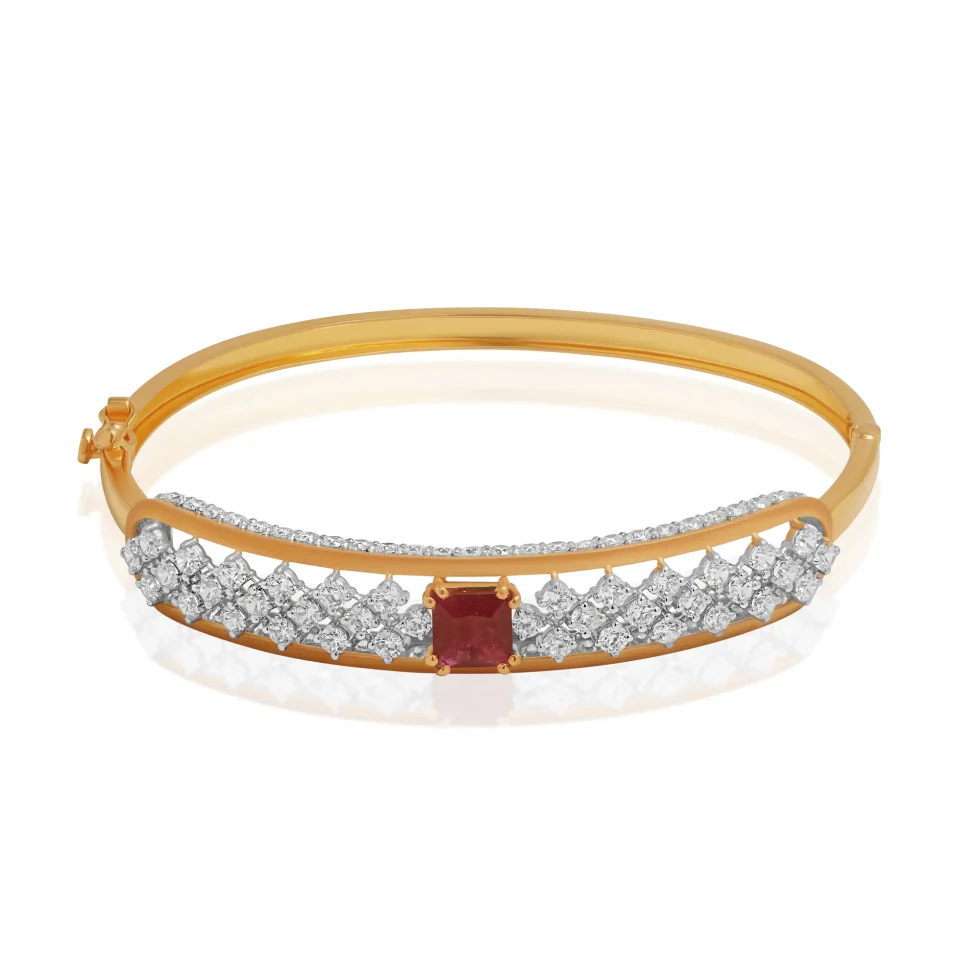Designed with fluid elegance, the Ruby Spark Kara features a radiant ruby accent complemented by intricately set stones along the band. The interplay of gold and diamond detailing creates a soft yet striking visual appeal.