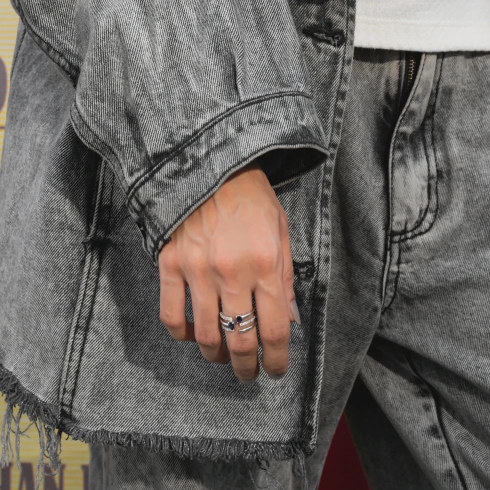 The Sapphire Orbit Ring blends contemporary style with timeless charm. Its triple-band design showcases deep blue sapphires paired with a line of shimmering diamonds, creating a striking balance of color and brilliance. The open, modern silhouette makes it a versatile piece.
