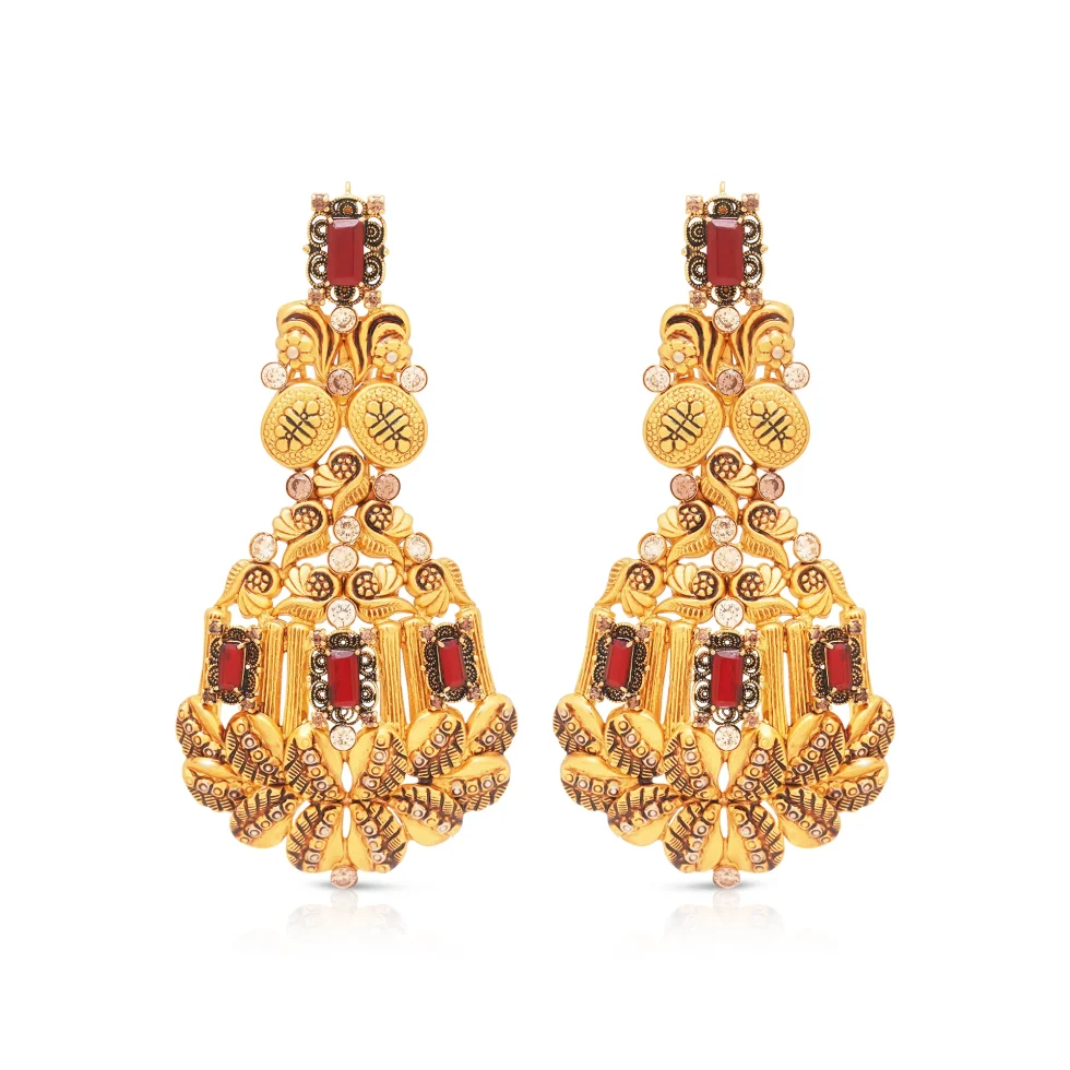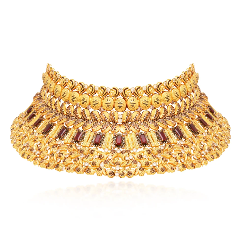 Defined by sculpted gold artistry and bold rectangular crimson accents, this choker brings a majestic balance of colour and craftsmanship—perfect for a bride seeking regal depth.