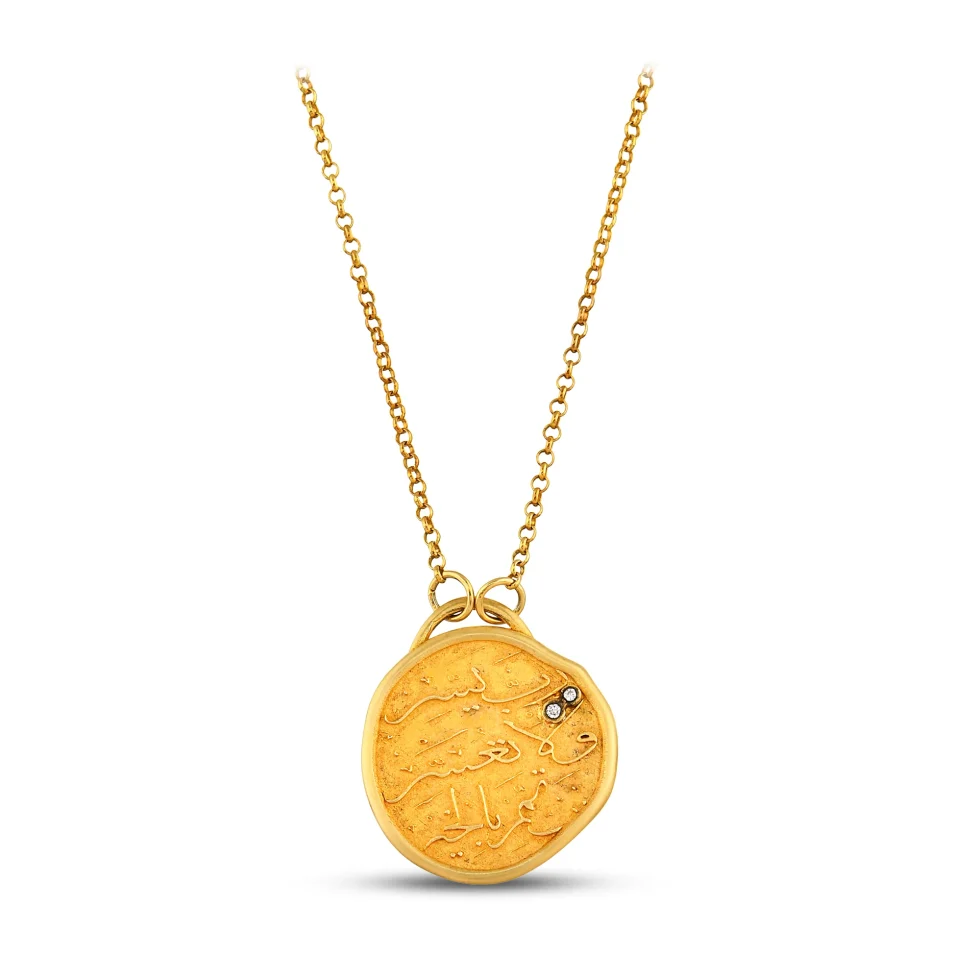 Inspired by early Islamic amulets, engraved pendants were traditionally worn close to the heart as symbols of faith, protection, and remembrance. Hand-carved inscriptions carried spiritual meaning, while delicate stones reflected divine light. This gold pendant continues a centuries-old tradition of devotion reimagined as timeless jewellery.