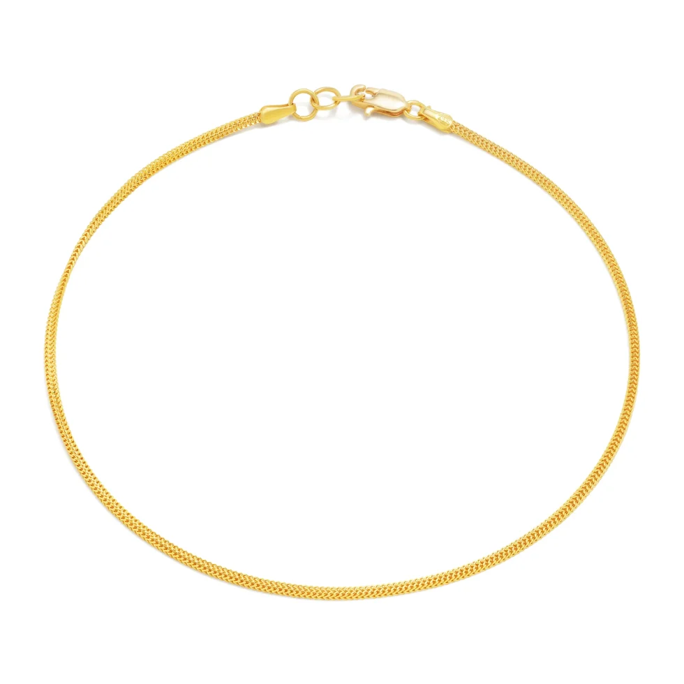 Refined, sleek, and timeless the Silvena Gold Anklet embodies pure sophistication in its simplest form. Crafted with a smooth, finely woven gold chain, it rests gracefully around the ankle, offering a seamless blend of comfort and elegance. Its fluid texture reflects light with soft brilliance, making it perfect for daily wear or subtle layering