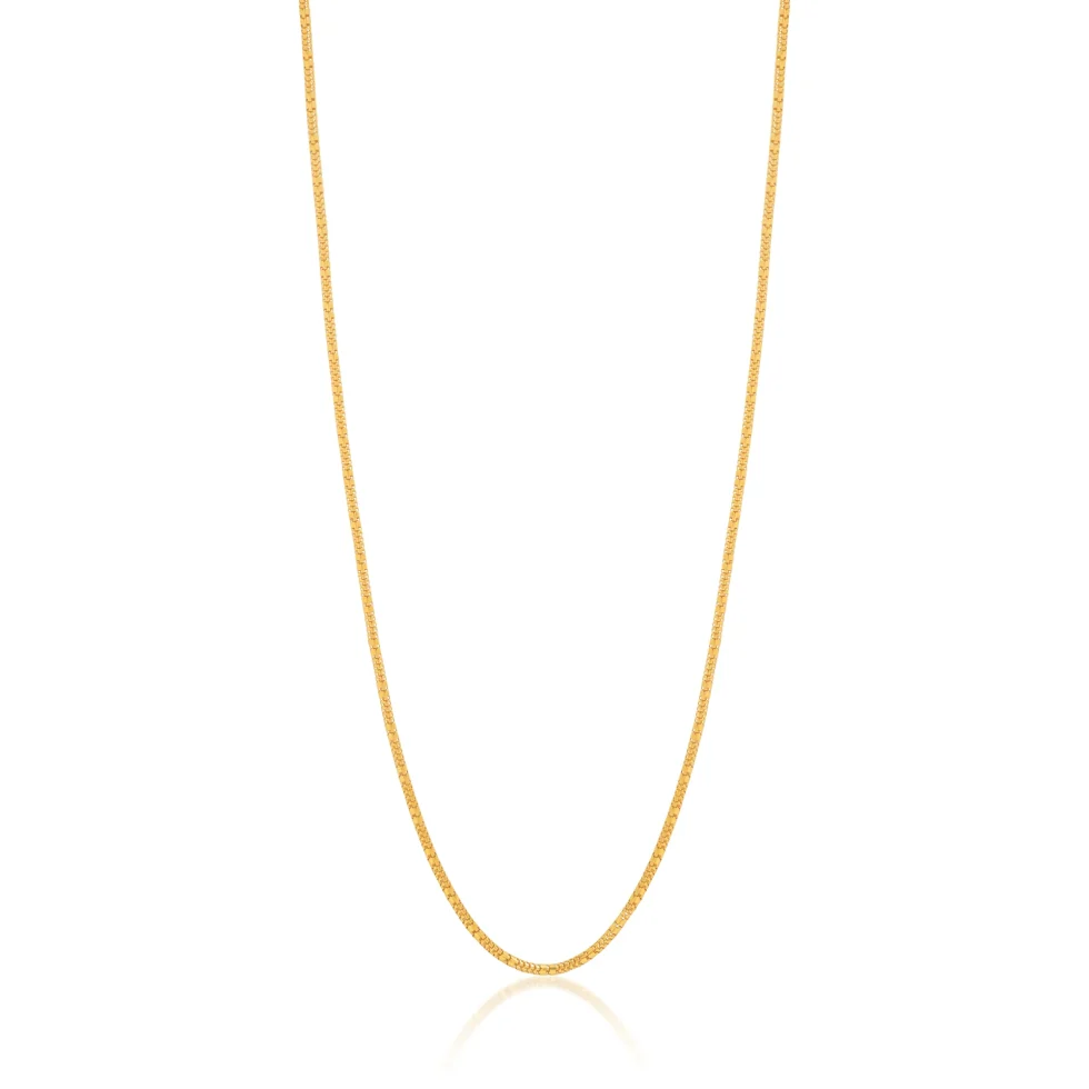This gold chain showcases a sleek and uniform link structure, offering understated elegance with a refined finish. Lightweight and versatile, it is perfect to wear alone or with a pendant.