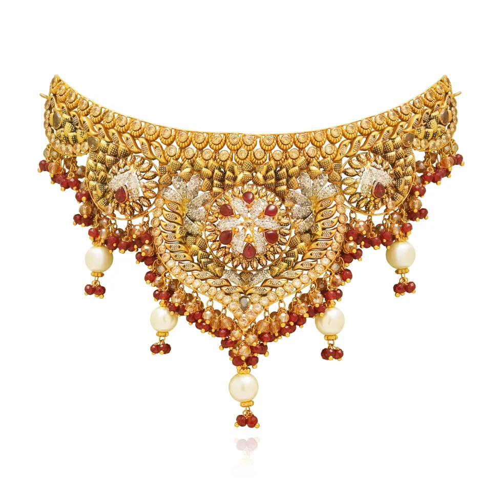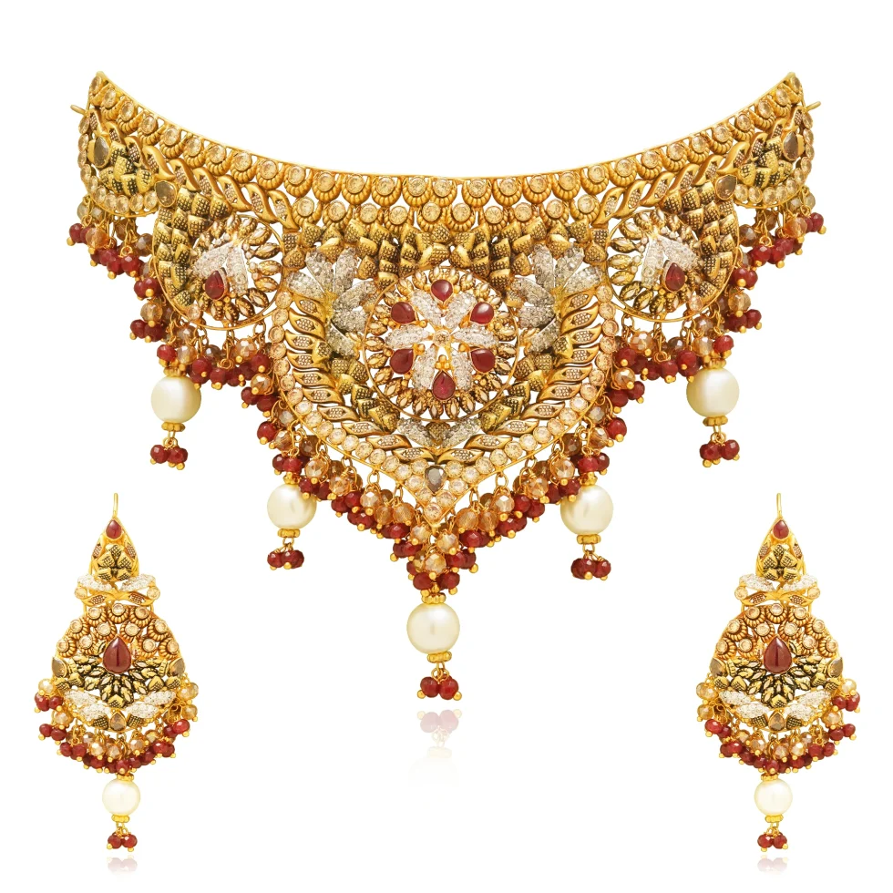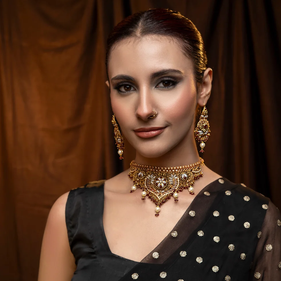 The Solenya Empress Set reflects the glory of royal artistry. Each intricate layer of gold filigree glows with warmth, while rich crimson drops and luminous pearls create a captivating contrast. Crafted for the modern bride with a love for timeless heritage, it’s a statement of elegance, strength, and legacy.