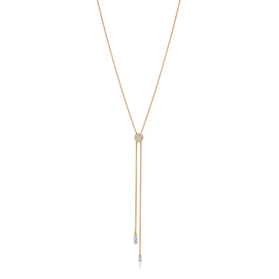 This refined diamond chain features a minimalist lariat silhouette with a single bezel-set diamond accent and fluid drop detailing. Designed for effortless elegance, it offers subtle brilliance that complements both everyday wear and evening styling.