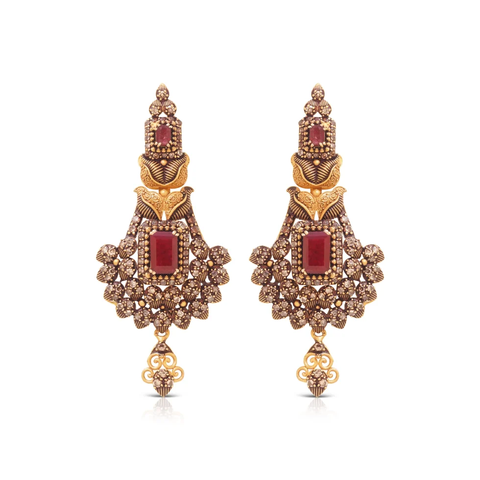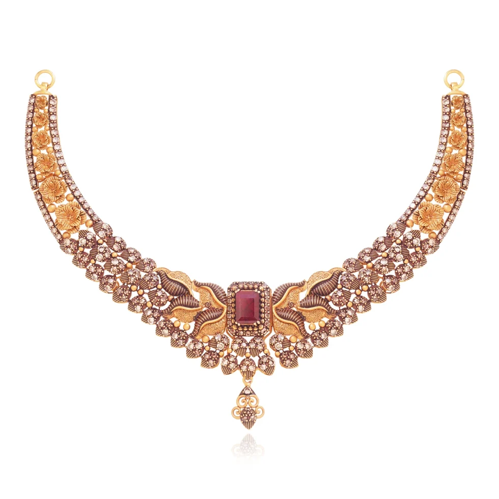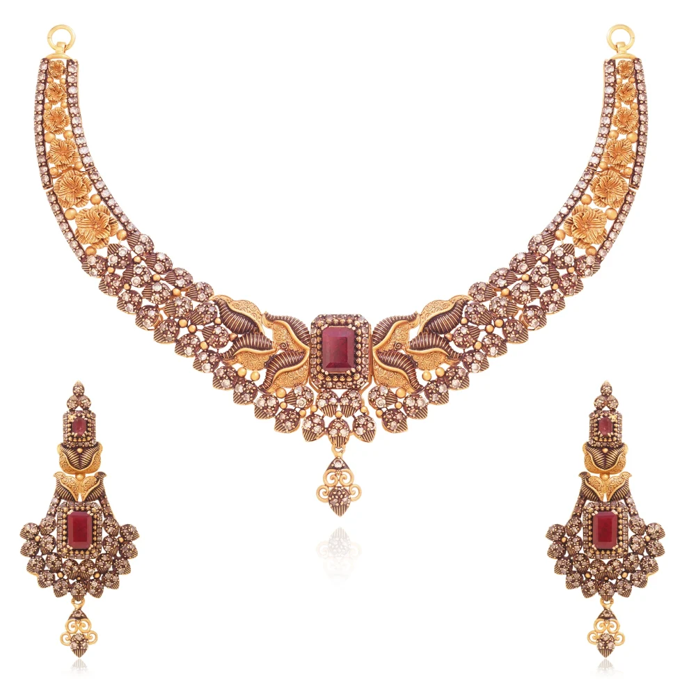 A luxurious expression of timeless tradition, the Sovereign Grace Necklace Set features layered gold motifs and rich red stone highlights. The detailed craftsmanship and balanced composition give this piece a commanding yet graceful presence.
