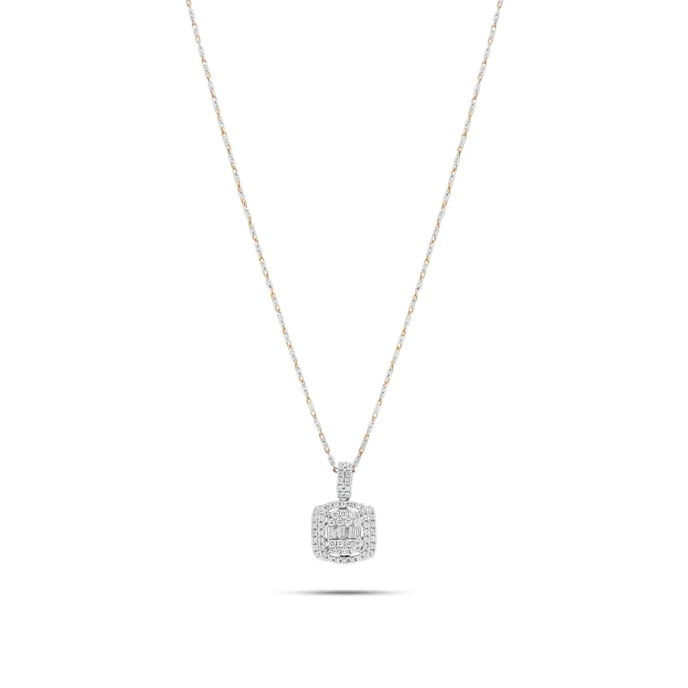 A sophisticated square diamond pendant featuring a structured baguette centerpiece framed by finely set round diamonds. Designed for balanced brilliance, it offers timeless elegance with a modern, polished finish.