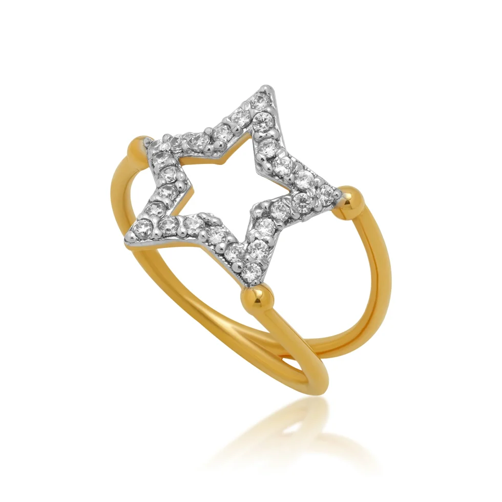 Radiant and full of wonder, the Starlit Glow Baby Ring captures the sparkle of childhood dreams. Crafted in polished gold, it features a beautifully sculpted star outlined with shimmering white stones that reflect light with every movement. The open star design symbolizes hope, joy, and the endless brightness