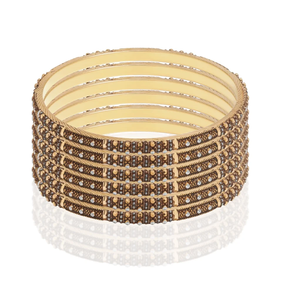 Crafted with finely layered gold bands and detailed textured accents, these bangles reflect understated royal elegance. The rhythmic pattern and rich surface detailing create a timeless look, making them ideal for both festive and heirloom wear.