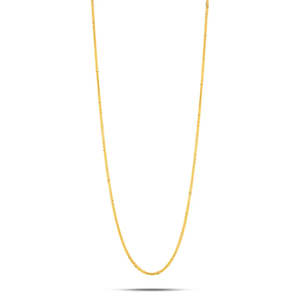 Crafted with a slender profile and subtle textured detailing, this gold chain offers a smooth drape with understated character. Its clean design makes it ideal for daily wear or elegant layering.
