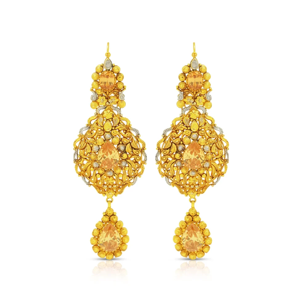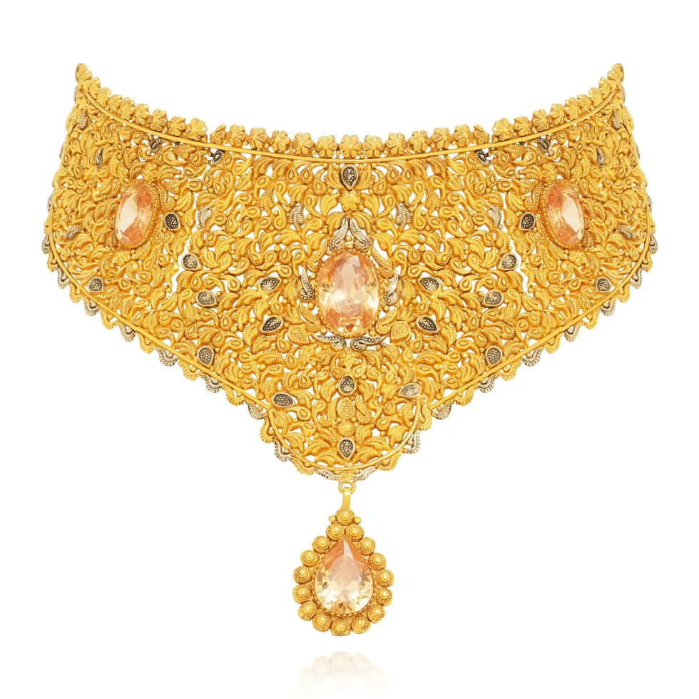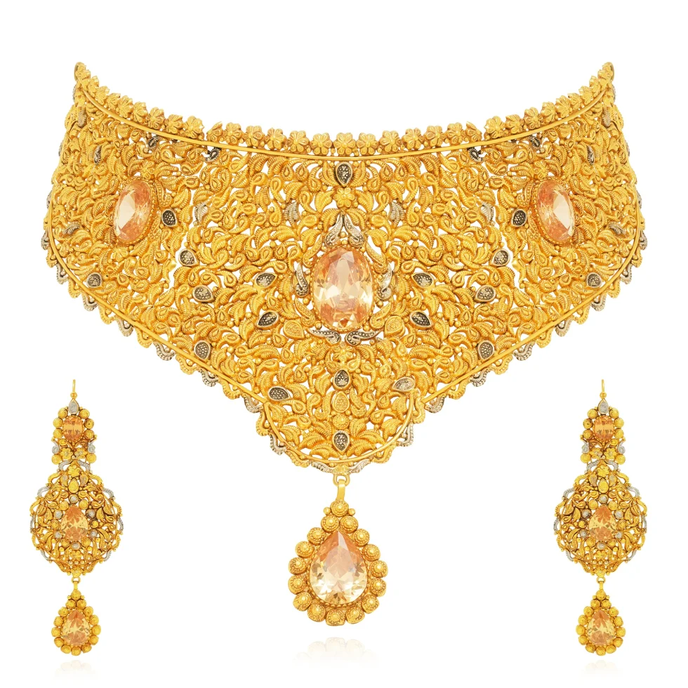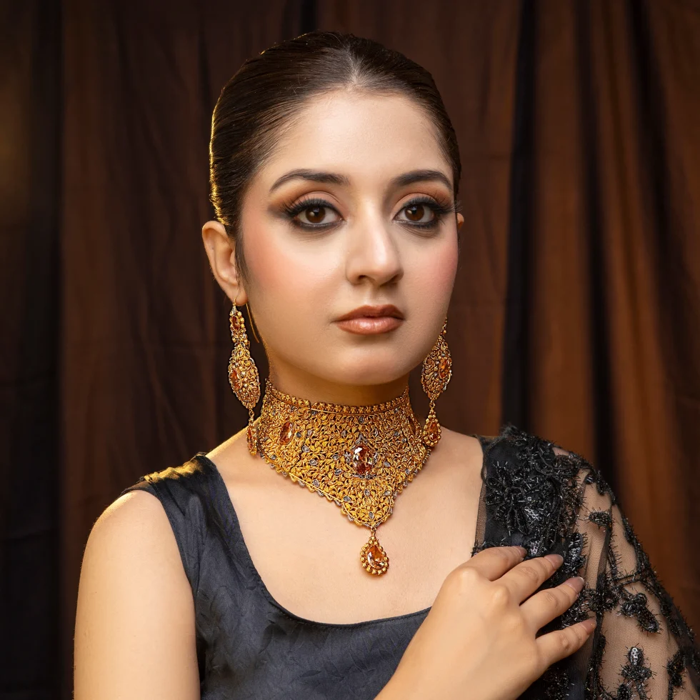 The Amberline Royale Set glows with golden warmth and royal splendor. Featuring intricate floral filigree and radiant amber-toned stones, it captures the beauty of timeless craftsmanship. Each curve and motif reflects heritage artistry, making it a majestic choice for grand occasions.