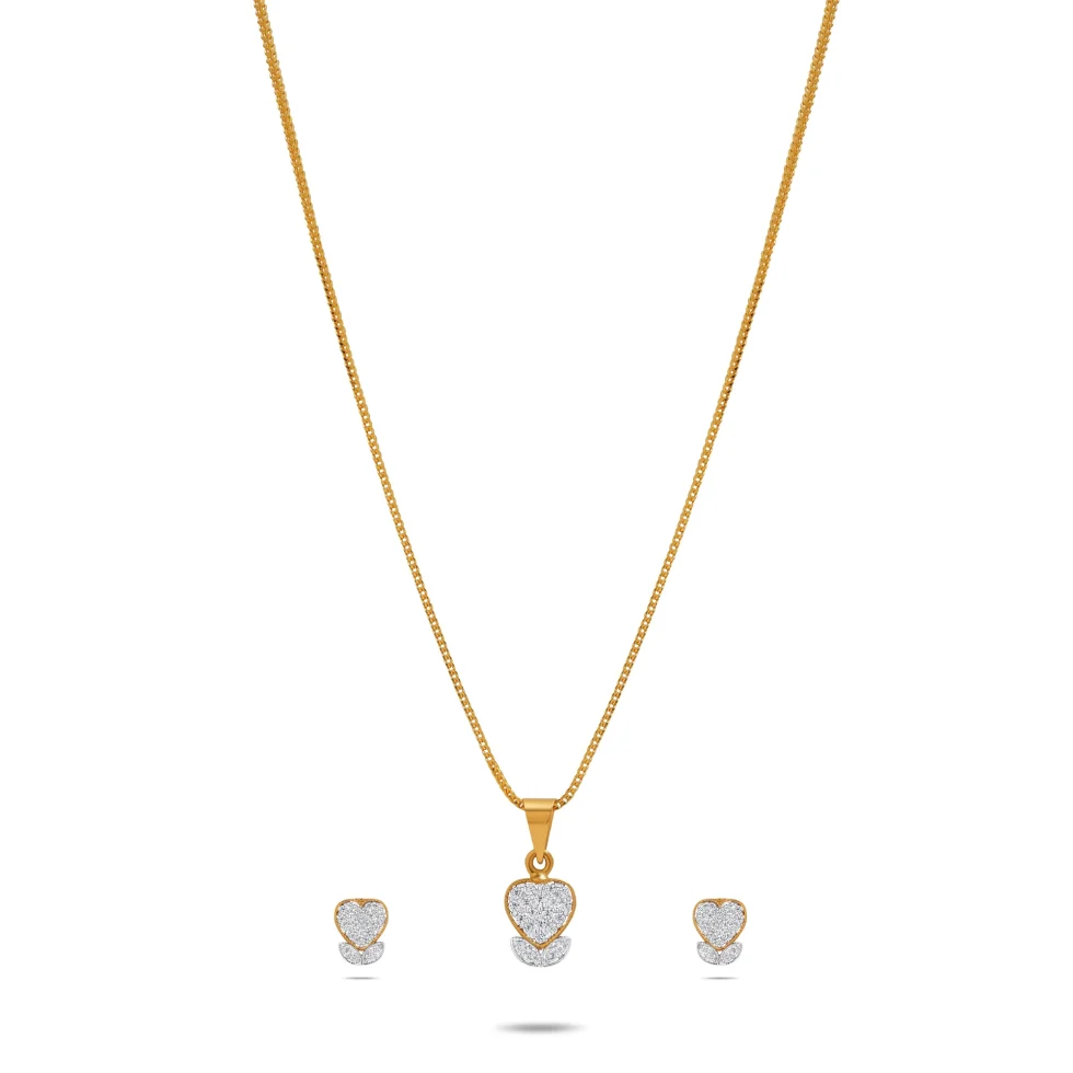 The Amora Heart Set is a timeless symbol of love and elegance. Crafted in radiant gold, the heart-shaped pendant and matching earrings shimmer with a blanket of sparkling stones that catch light from every angle.
