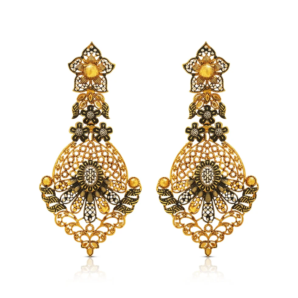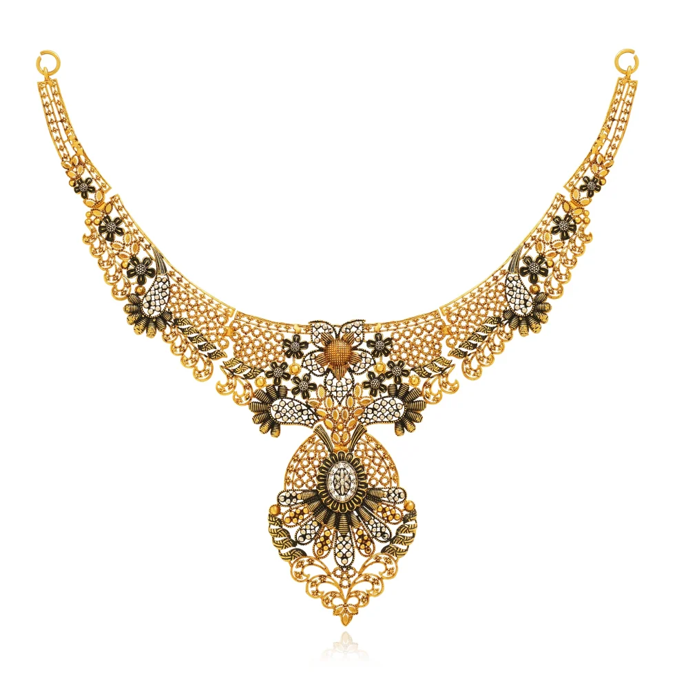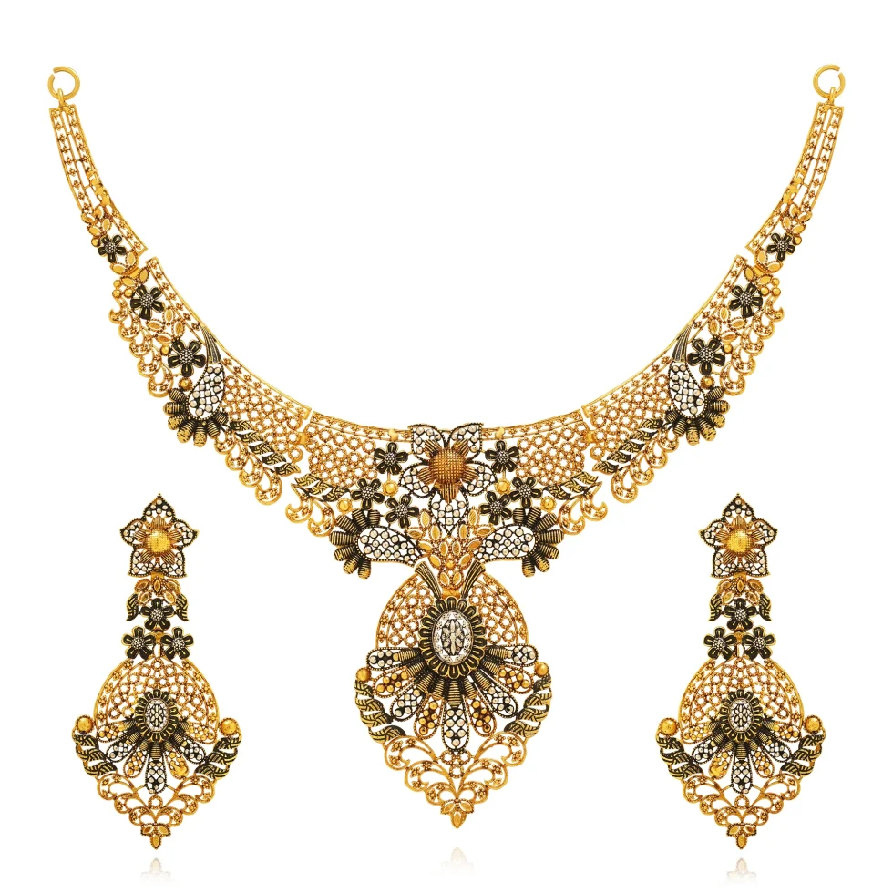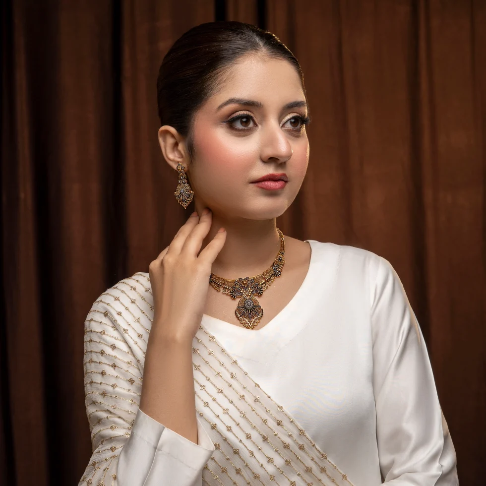 A rich fusion of meshwork, carved florals, and decorative detailing, this set reflects the beauty of traditional craftsmanship. The grand pendant and coordinated earrings offer a look steeped in culture and refined artistry.
