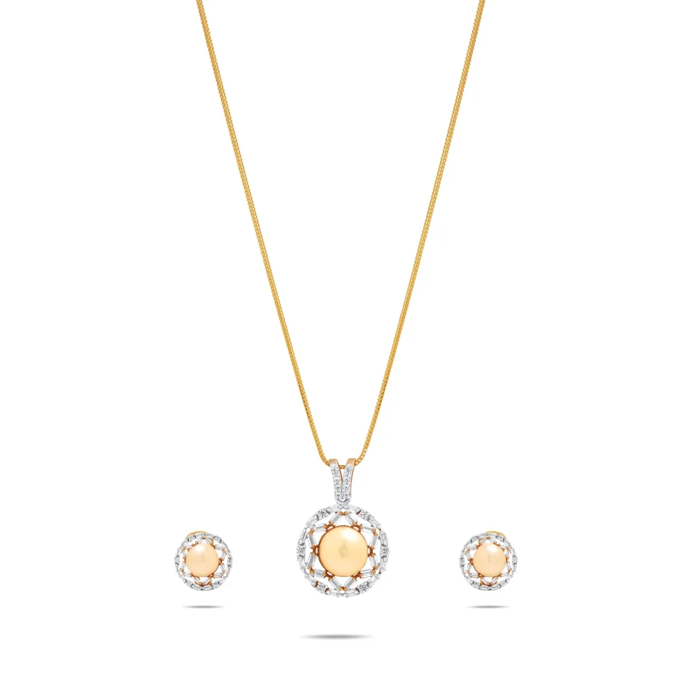 The Aureum Pearl Set embodies timeless sophistication with its radiant round design. A luminous golden pearl rests at the heart of each piece, encircled by a sparkling halo of stones that enhance its brilliance. The pendant and earrings exude classic luxury, combining elegance and balance in perfect harmony