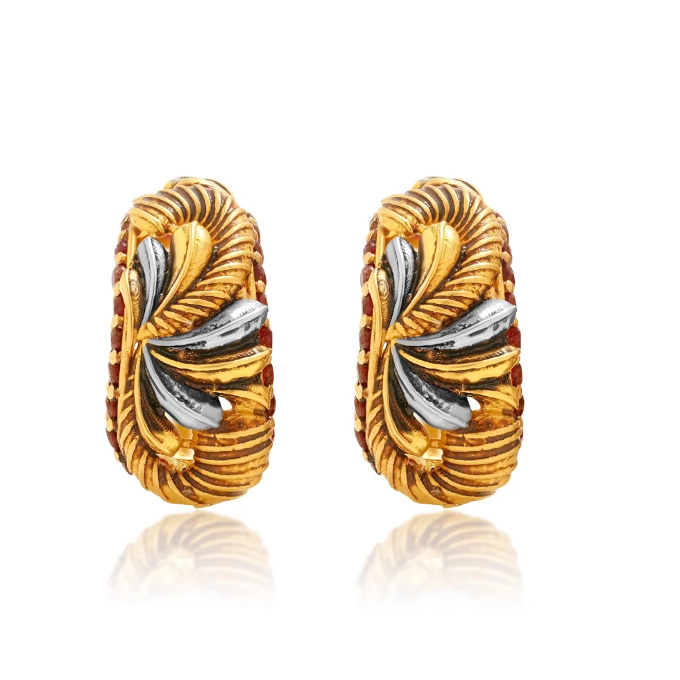 The Auric Flame Earrings ignite elegance with sculpted gold patterns highlighted by rich crimson accents. Each curve glows with masterful artistry, symbolizing strength, vitality, and timeless charm.