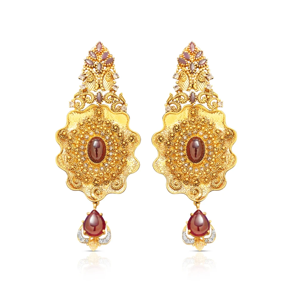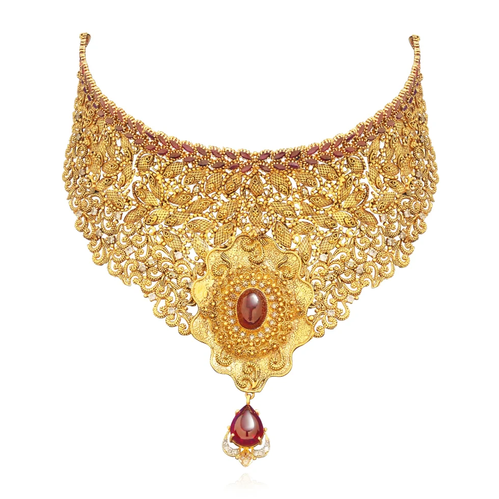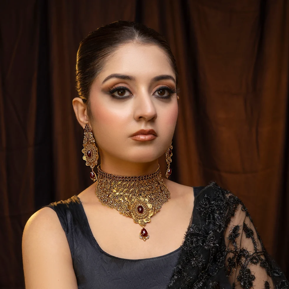 The Celene Royale Set captures regal sophistication in every curve. Its handcrafted gold lacework and deep red centerpiece reflect power, passion, and purity an exquisite heirloom that embodies the essence of bridal majesty.