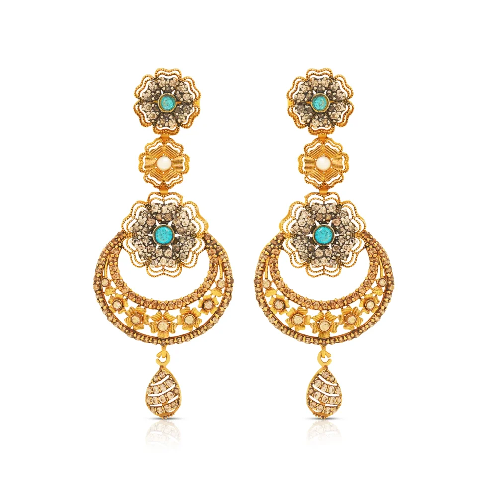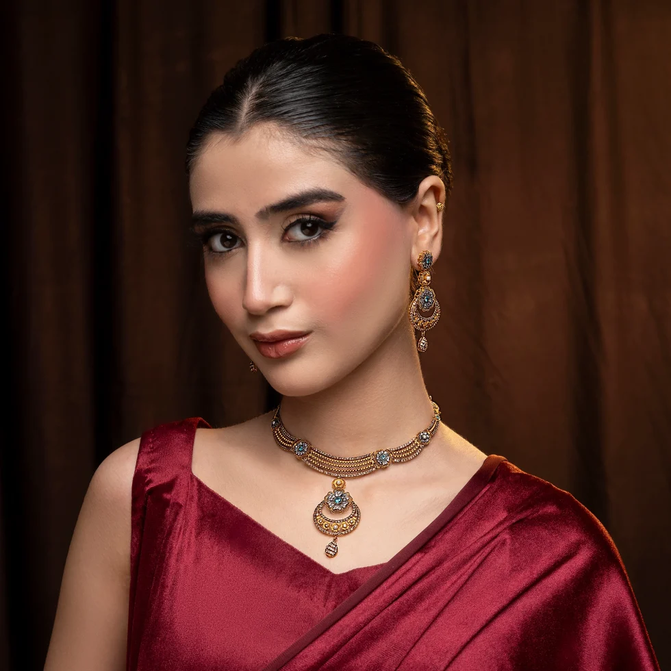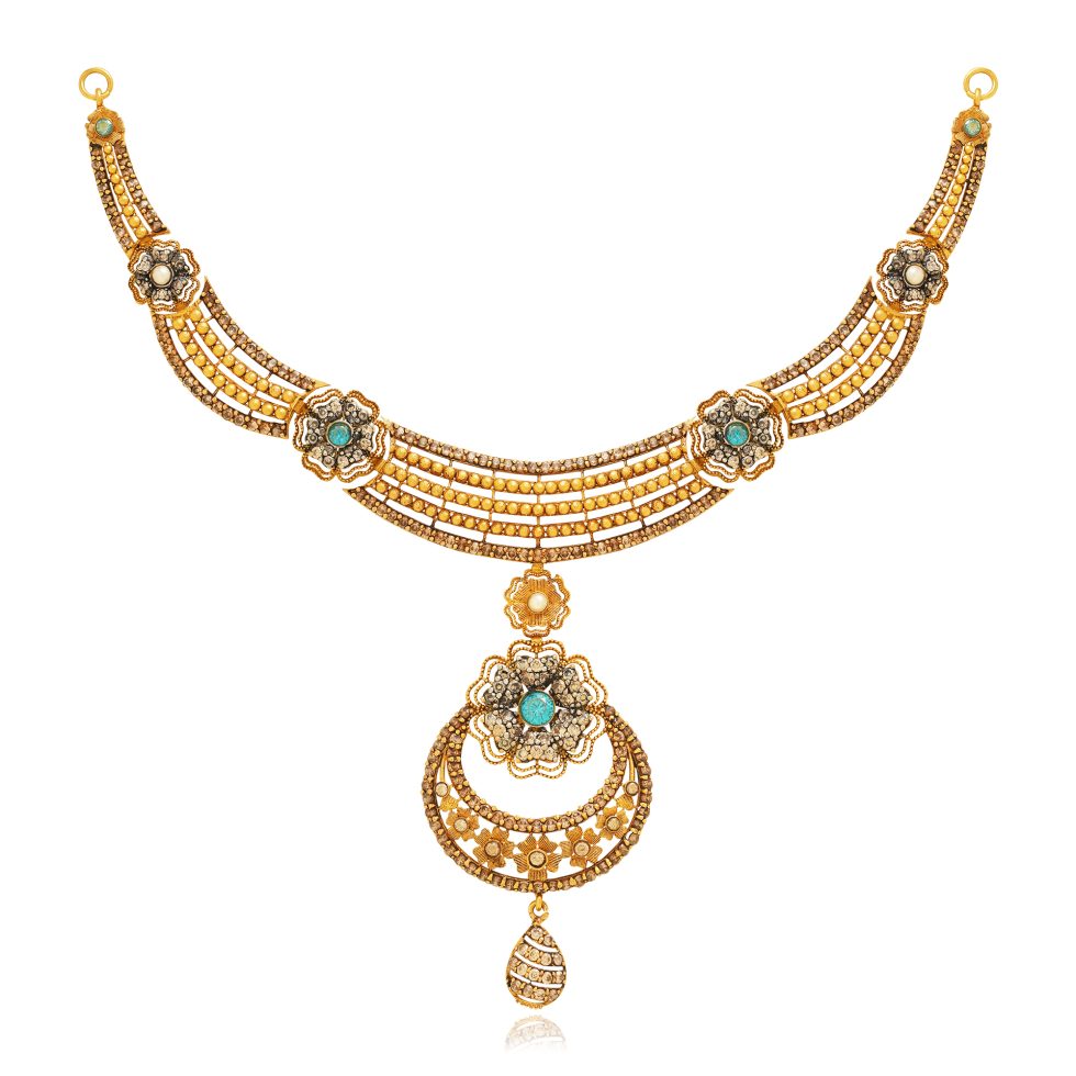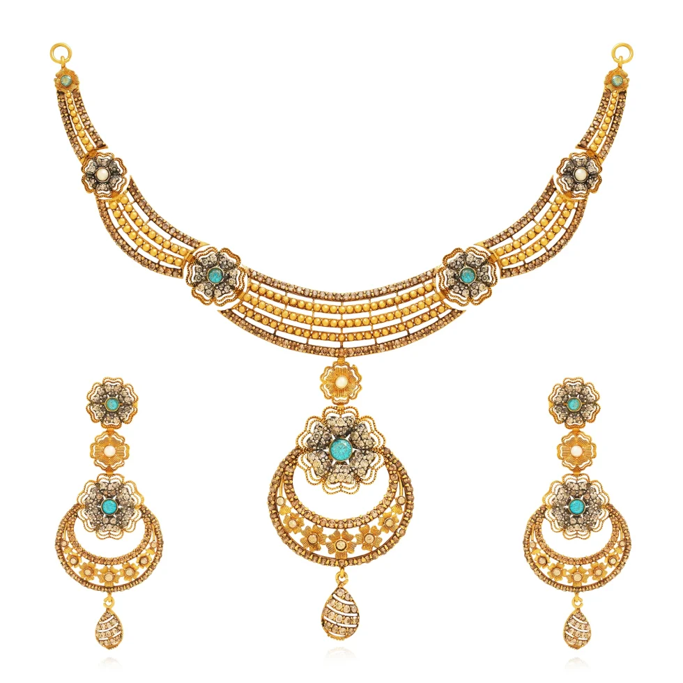 A beautiful interplay of layered petals and ornate gold textures, this design flows gracefully across the neckline. The soft turquoise centers add a refreshing pop of color, creating a look that feels both ethereal and timeless.