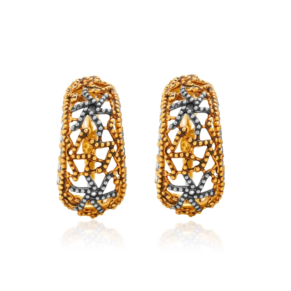 The Celestine Gold Earrings echo the beauty of the cosmos, featuring delicate openwork and dazzling stone embellishments. Their unique pattern radiates light and luxury a perfect fusion of tradition and modern design.