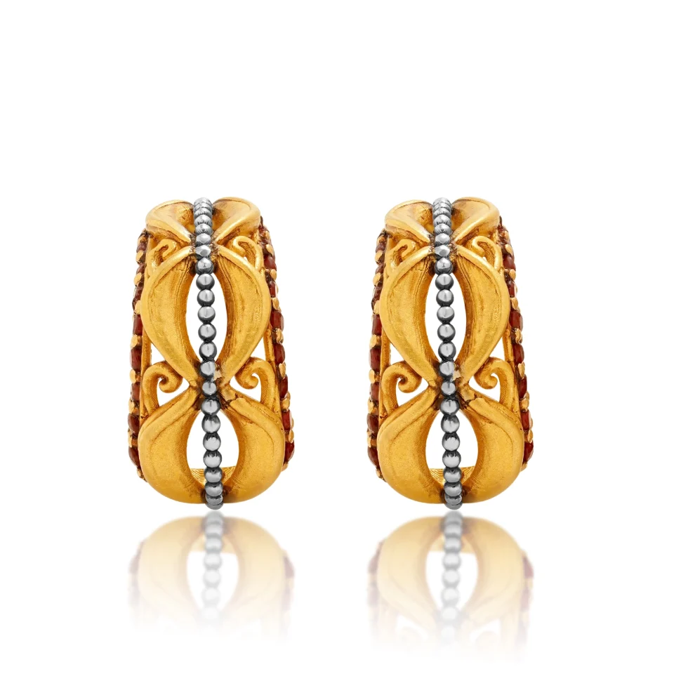 The Crimson Loop Earrings embody bold artistry and timeless grace. Crafted in radiant gold with flowing sculptural curves, they feature a striking line of ruby-red stones framed by dark metallic detailing. The contrast of warm and cool tones creates a refined statement of luxury.