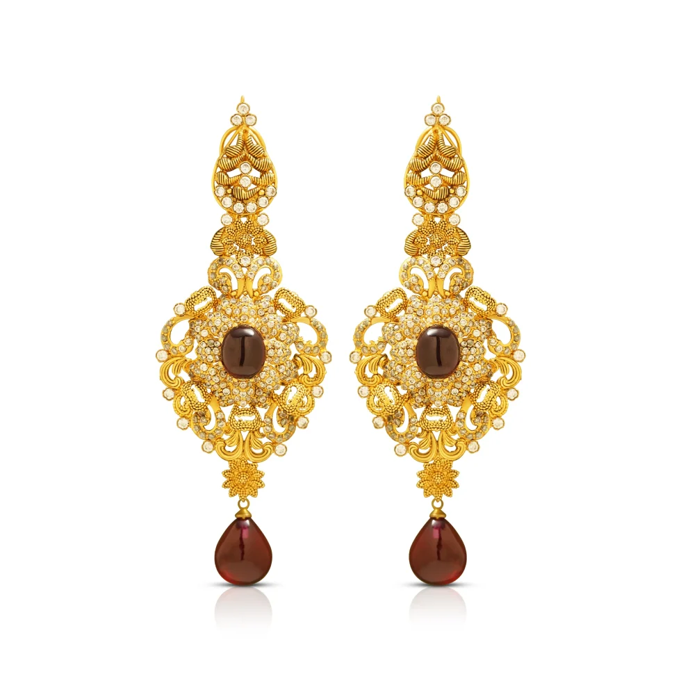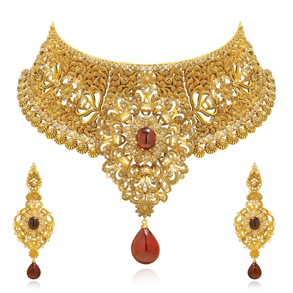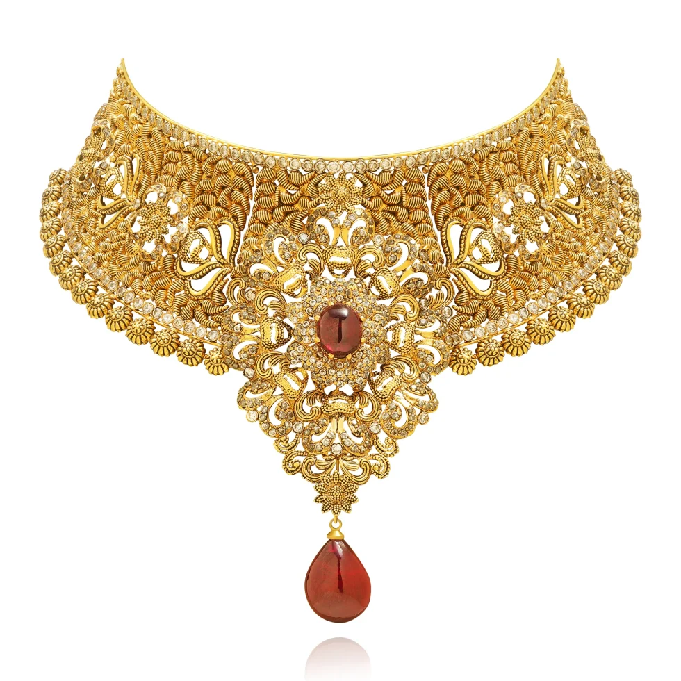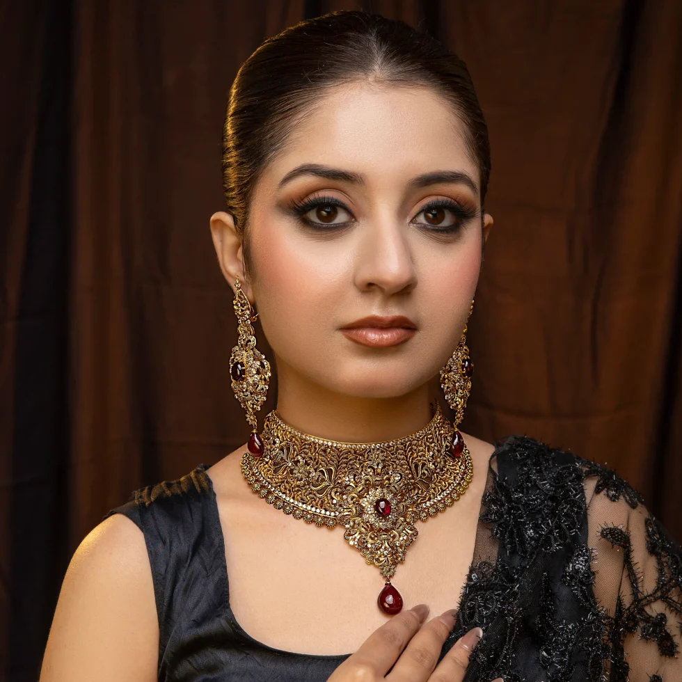 The Crimson Royale Set blends majestic artistry with heritage finesse. The bold red cabochon framed in elaborate goldwork evokes a sense of imperial elegance a true symbol of strength, culture, and everlasting beauty.