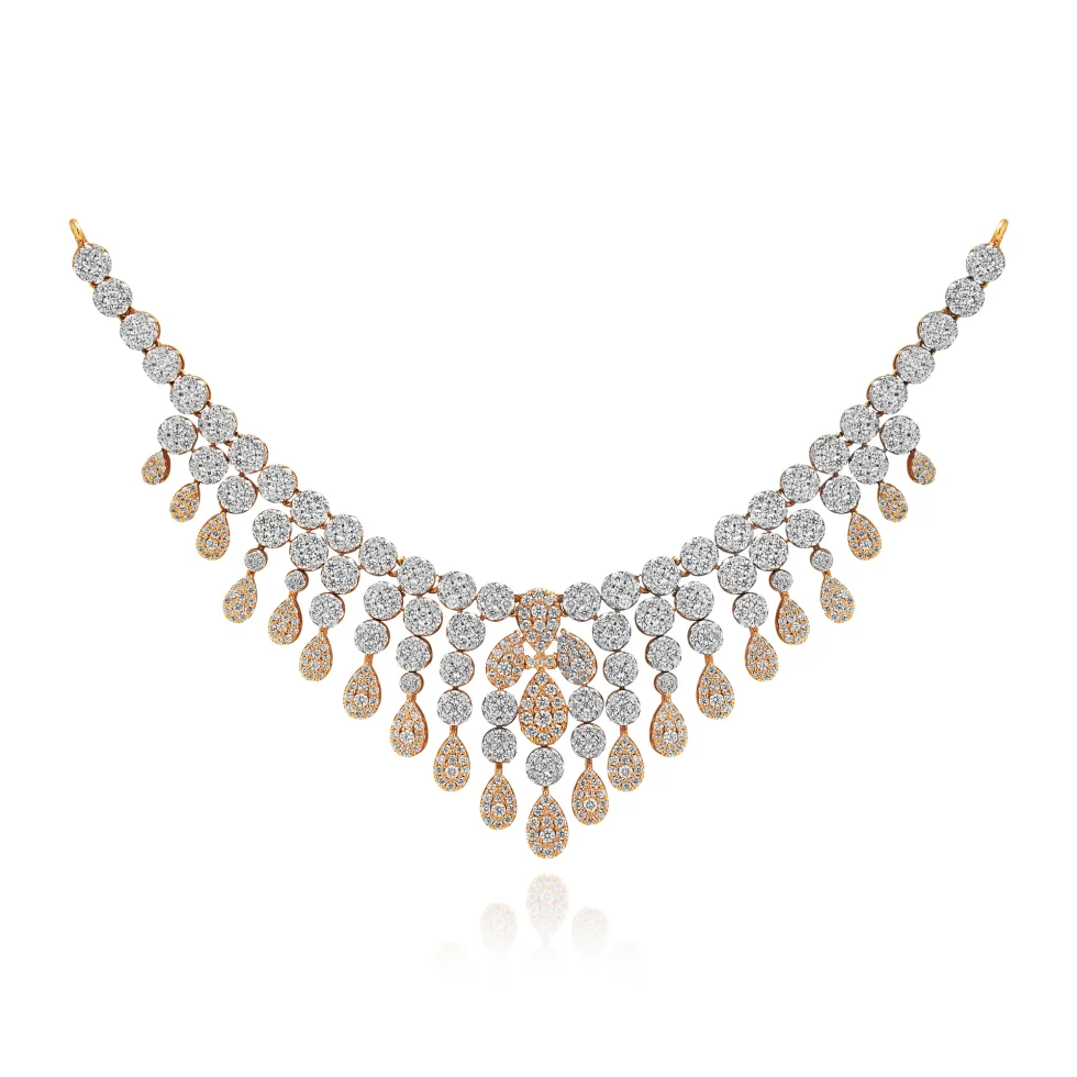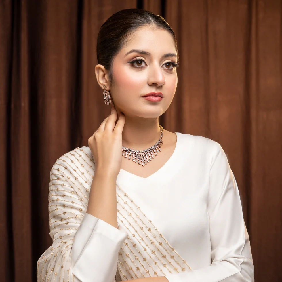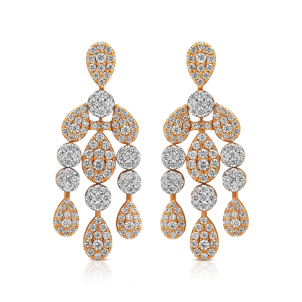 A breathtaking waterfall of shimmering round and teardrop motifs, each crafted to reflect maximum brilliance. The layered drops create a fluid, radiant silhouette that brings red-carpet elegance to any bridal or formal look.