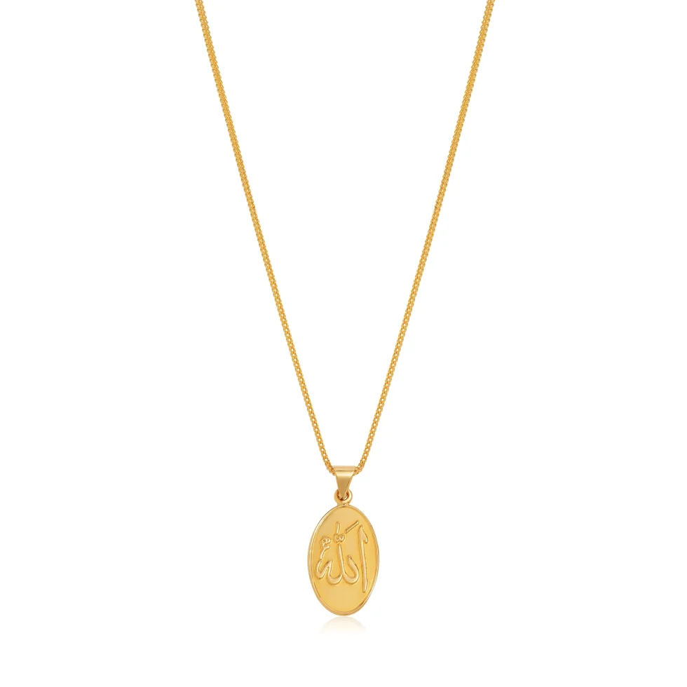 The Divine Oval Pendant is a graceful symbol of faith and devotion. Crafted in radiant gold, it features the sacred Arabic inscription of “Allah,” rendered with serene simplicity and refined detail. Designed to be worn close to the heart, it embodies spiritual strength, purity, and eternal connection.