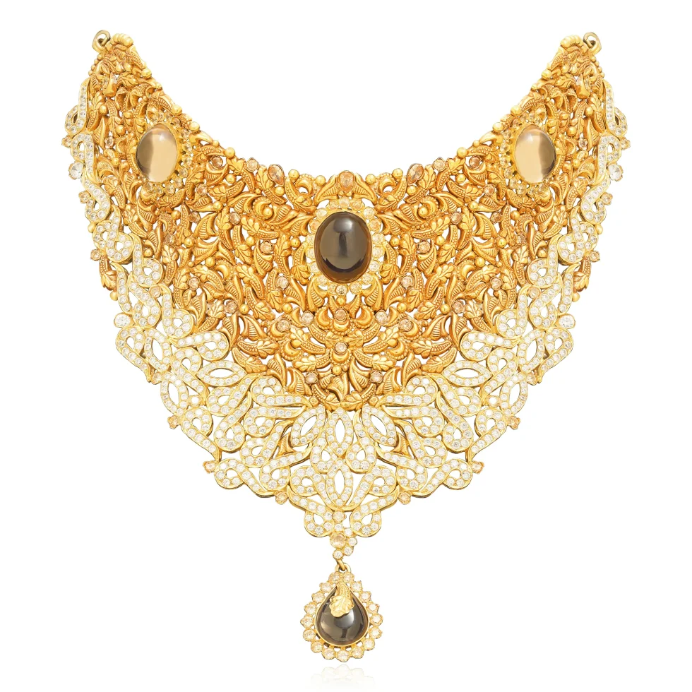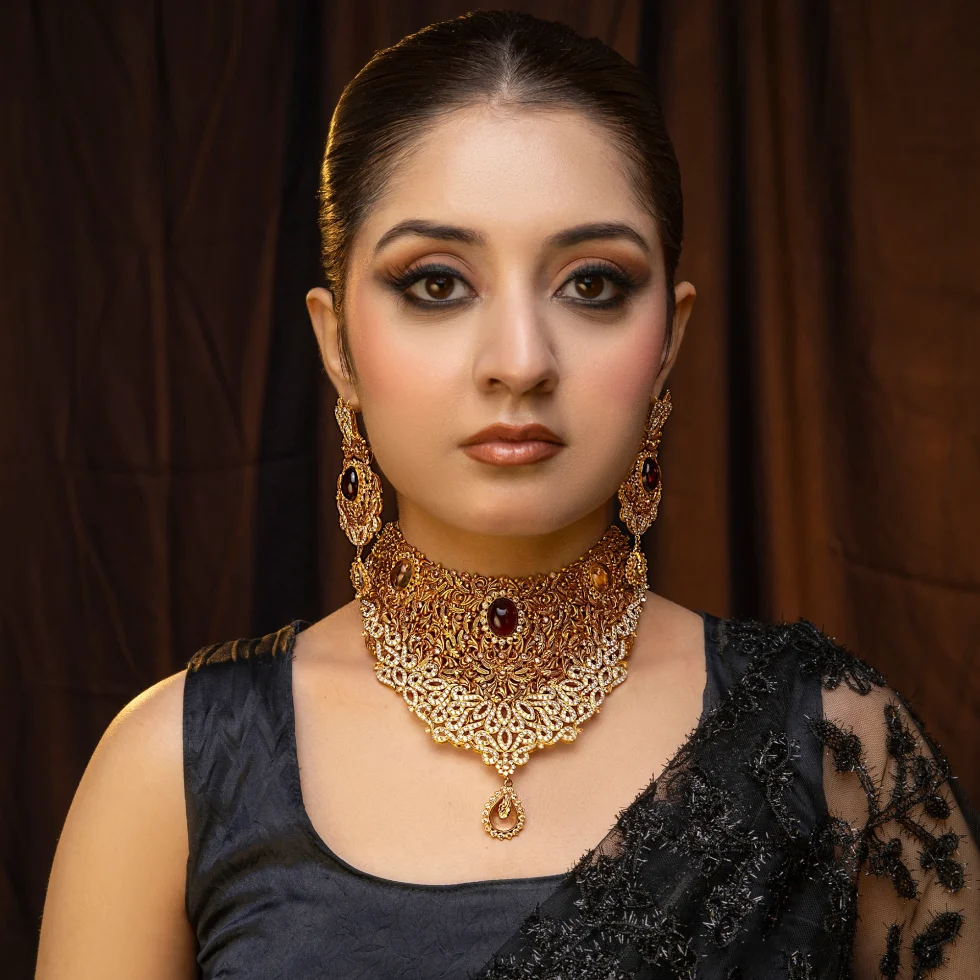 The Elenora Regal Set merges classical filigree craftsmanship with majestic gold tone and luminous stones. Its layered patterns exude power, poise, and refinement designed for the woman who embodies royalty.