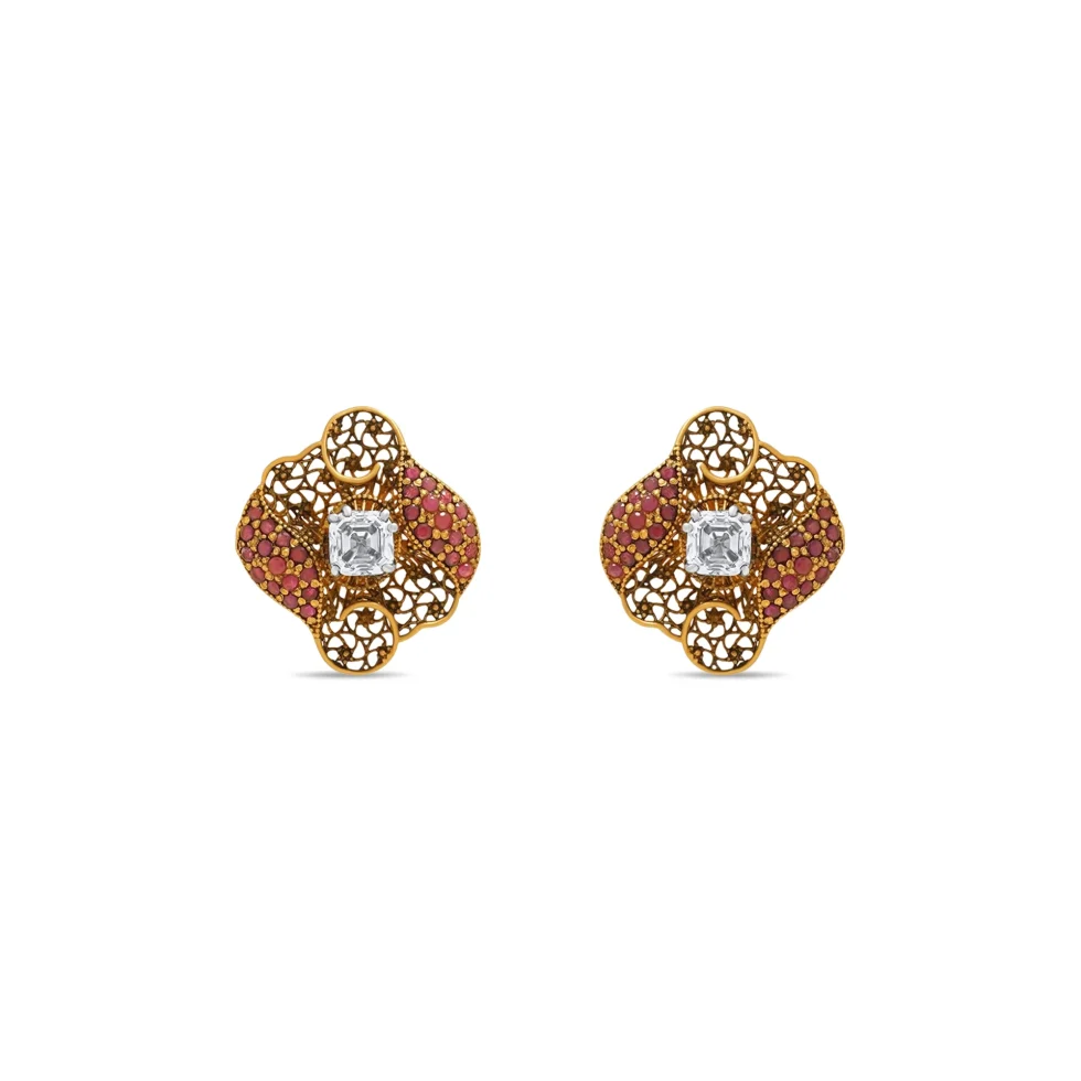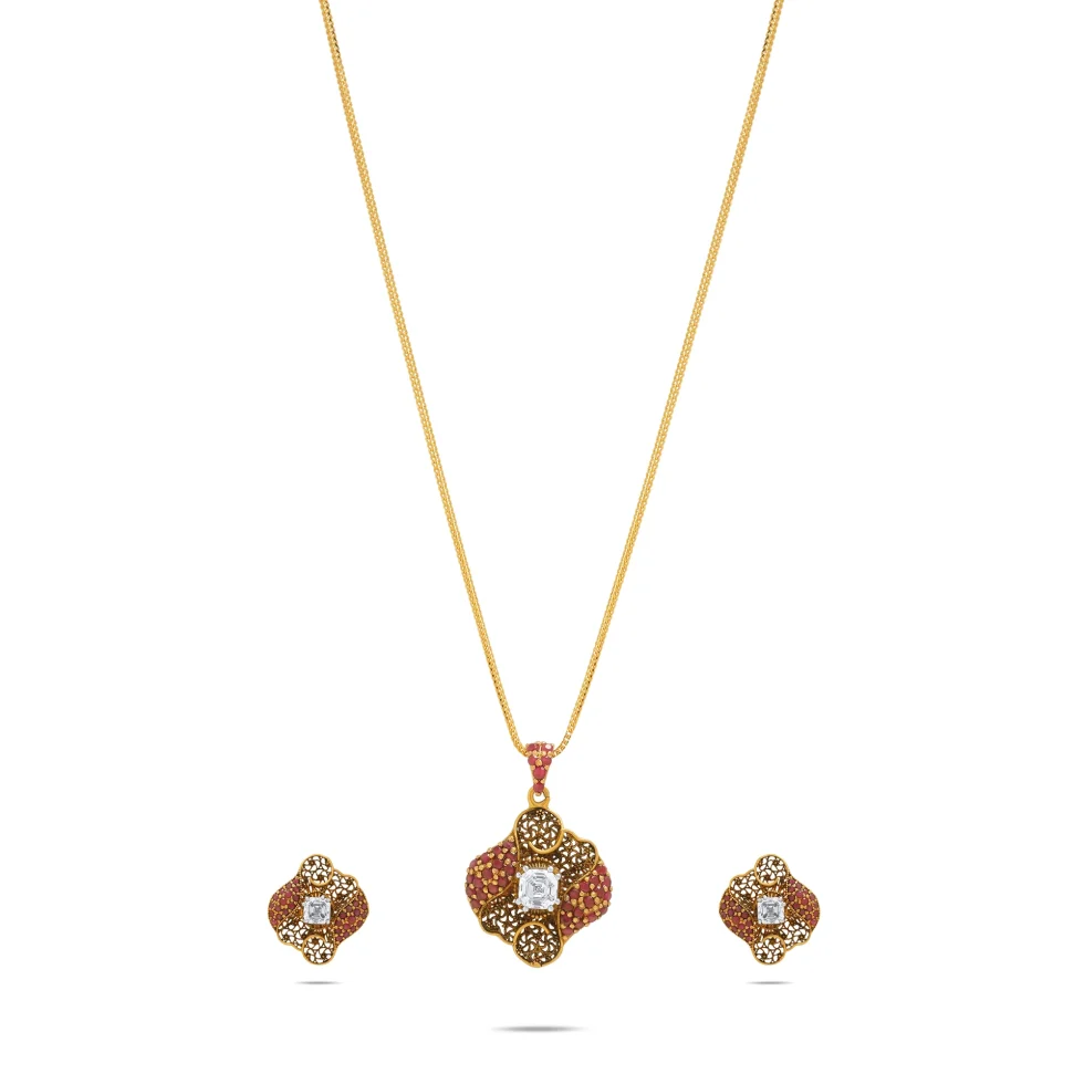 The Elowen Royale Set combines vintage design with modern opulence. The ornamental gold filigree and ruby-toned accents highlight a radiant center stone, creating a look of grandeur and refinement perfect for women who appreciate heritage elegance.
