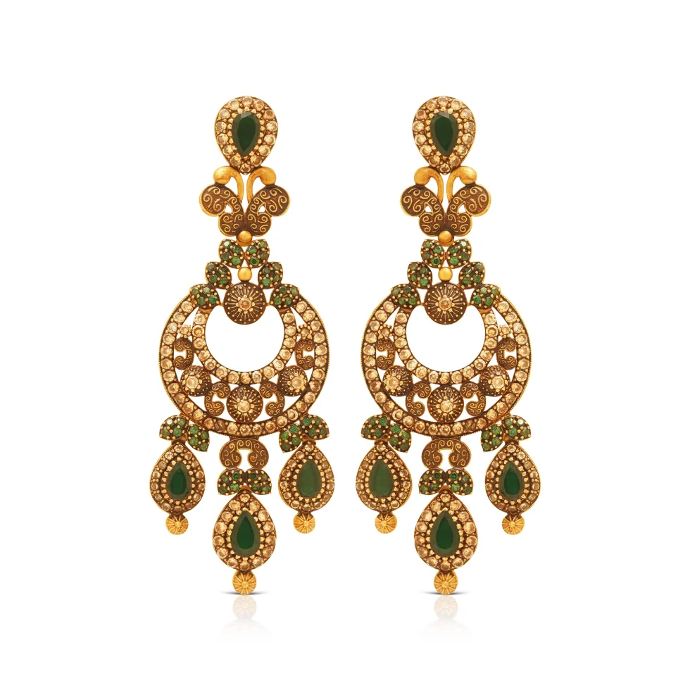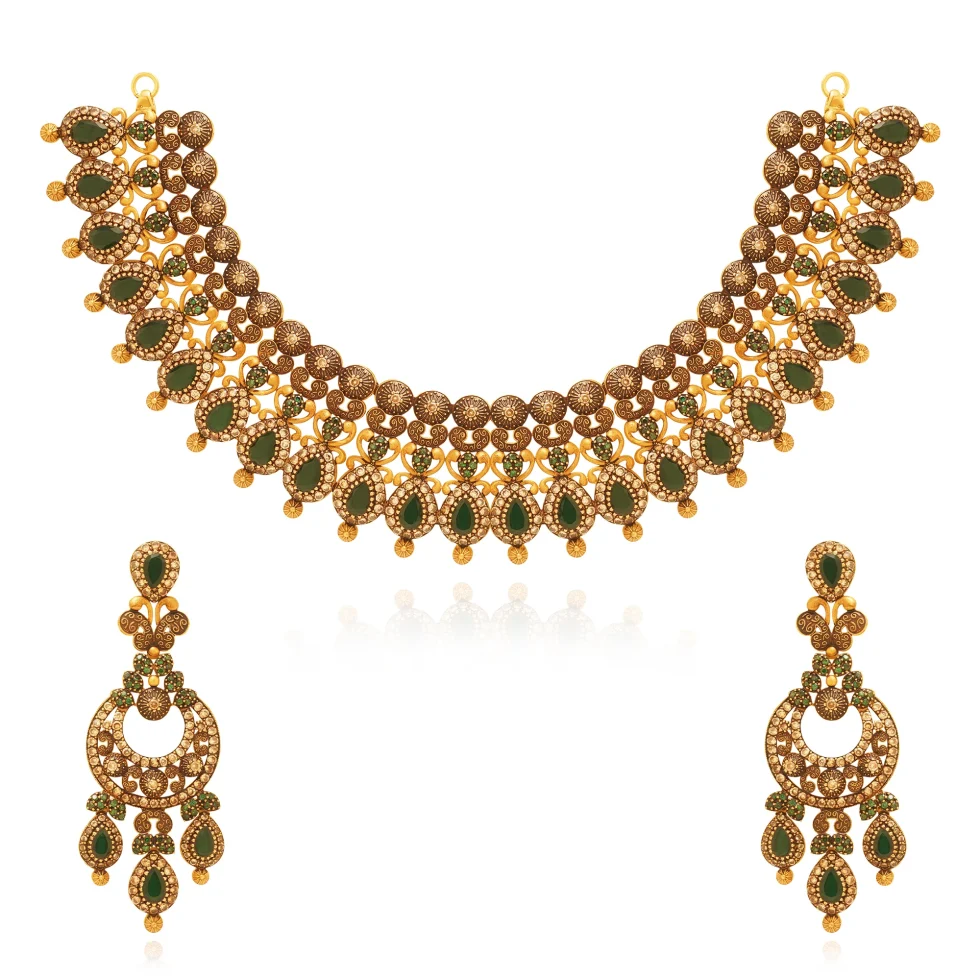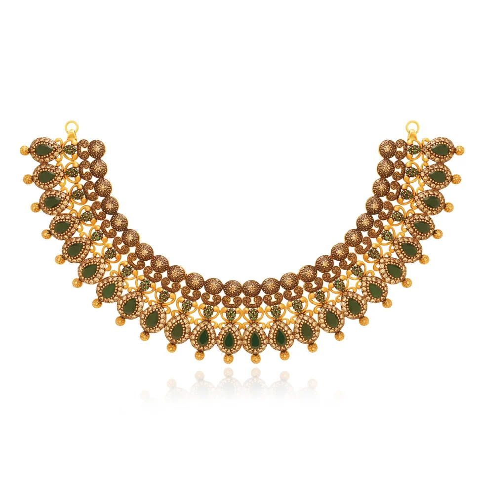 A graceful fusion of textured gold spheres, pear-shaped green accents, and intricate lattice detailing. The layered fringe design creates a flowing, regal silhouette, making this set a stunning choice for brides who adore classic richness with a touch of emerald luxury.
