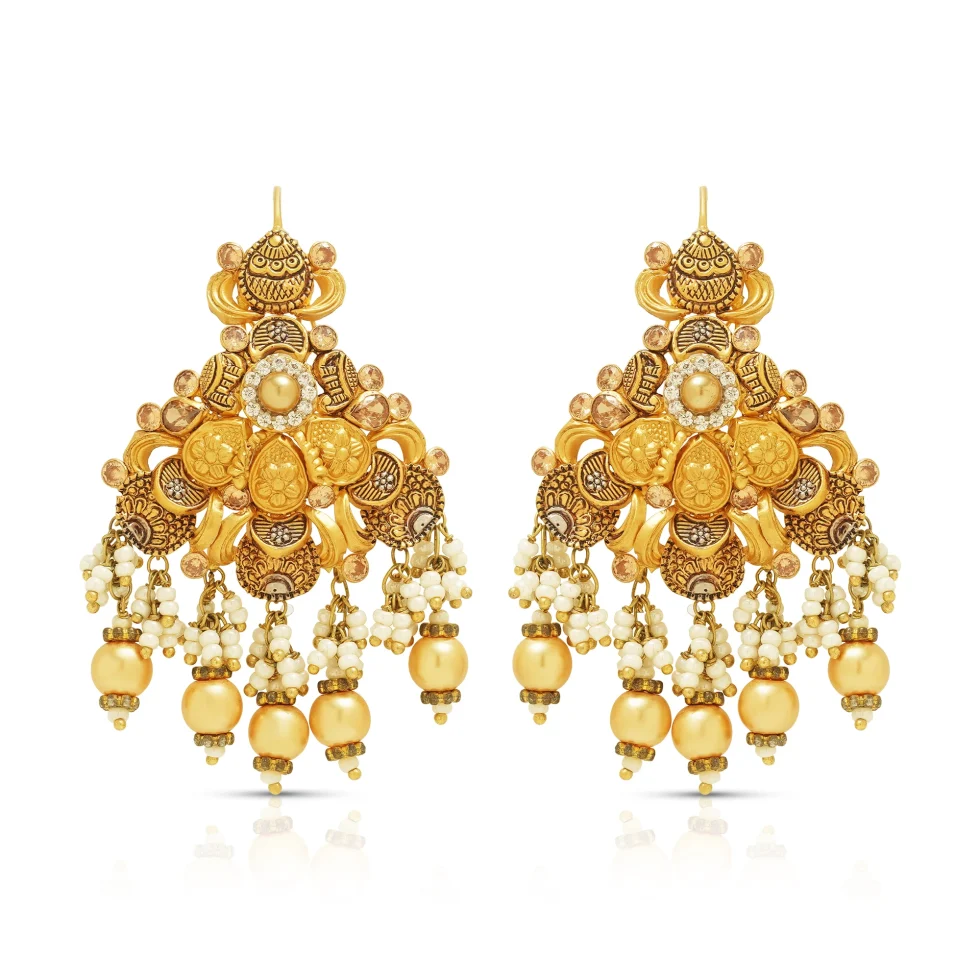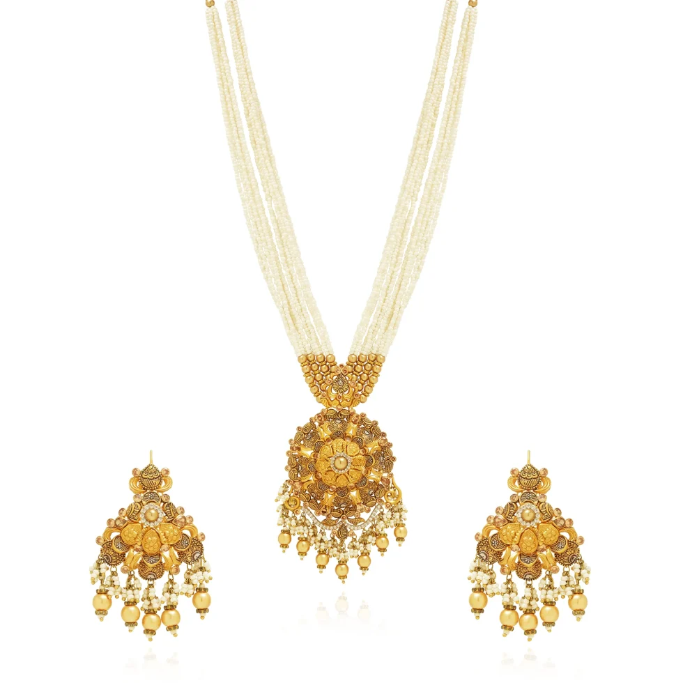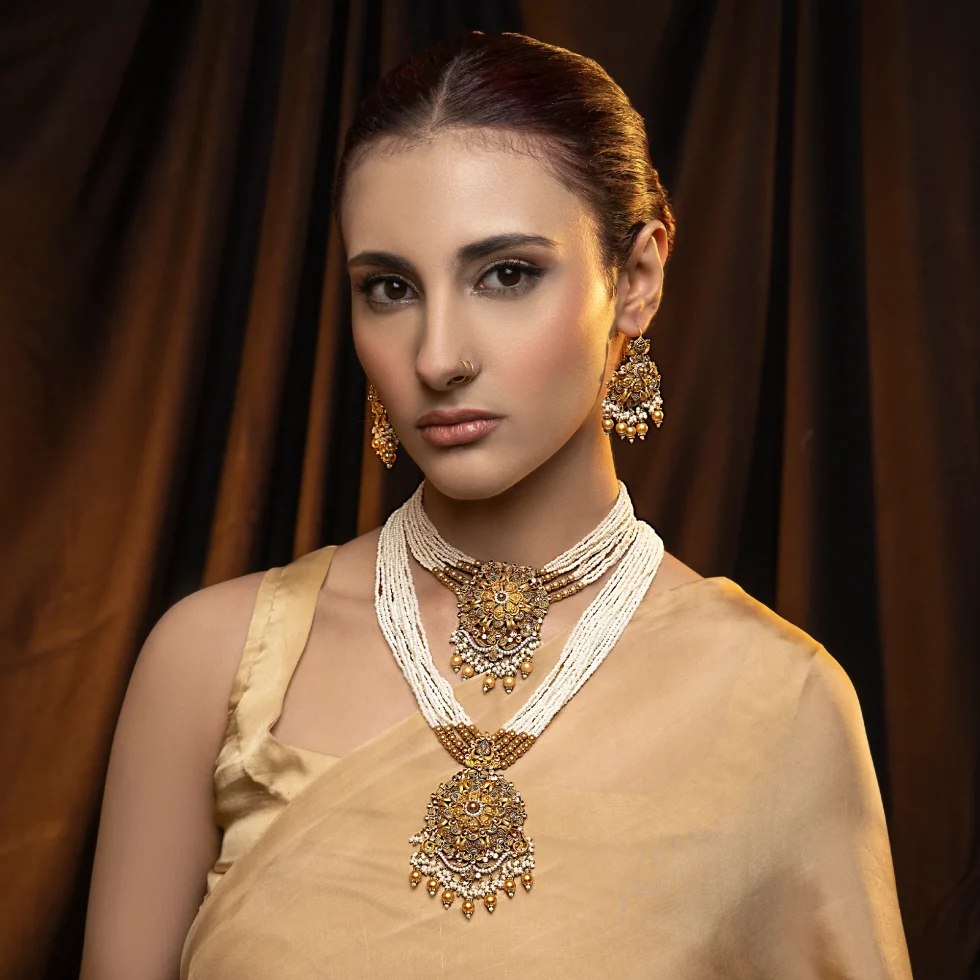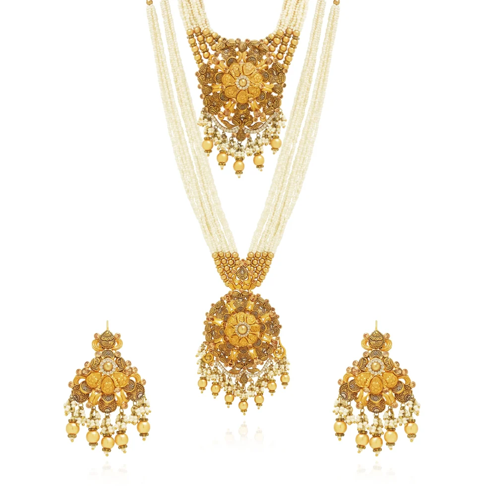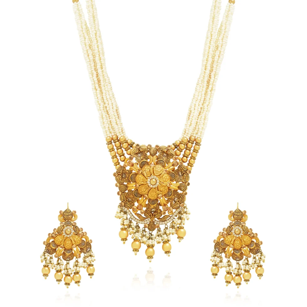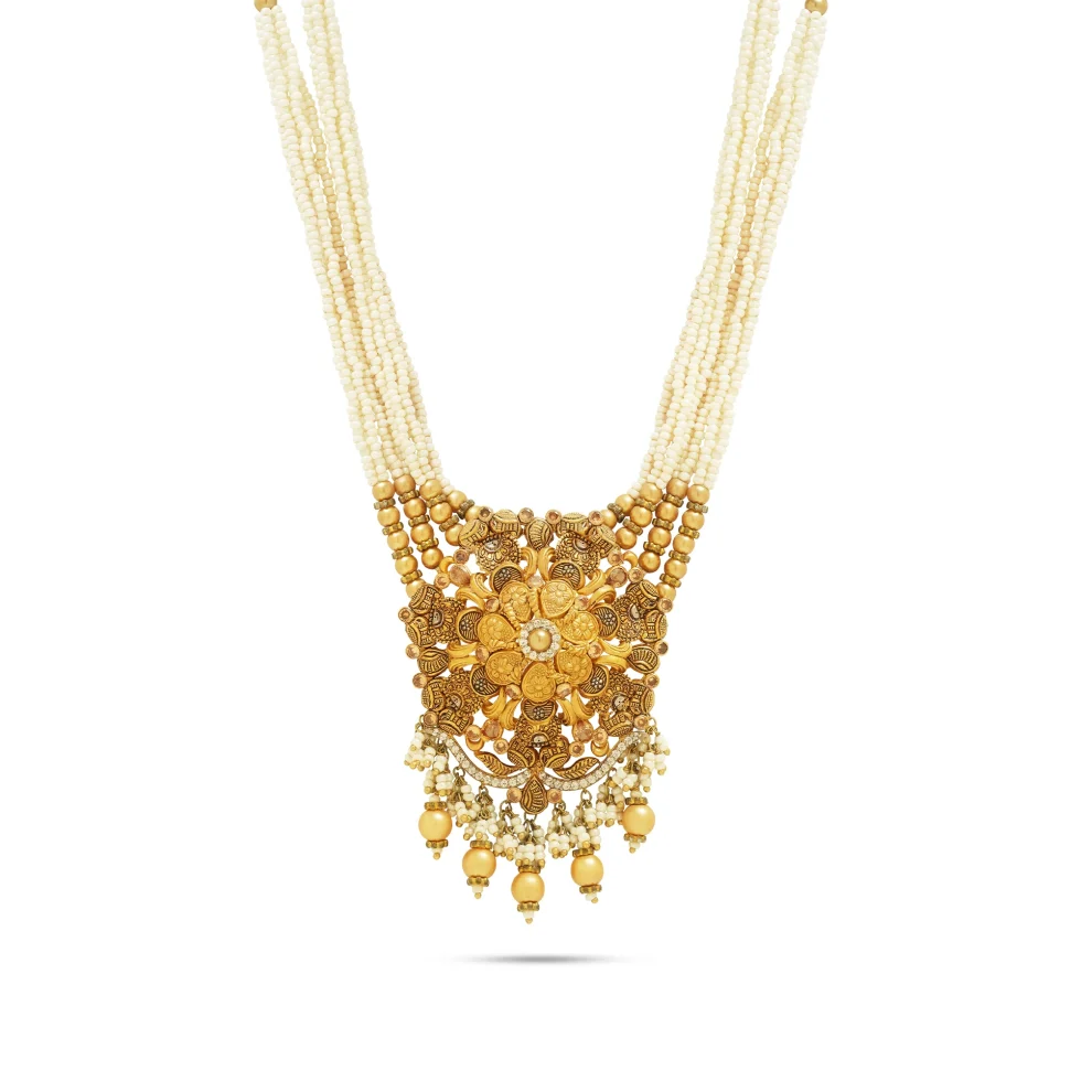 Graceful and majestic, the Golden Bloom Mala Set features intricately carved floral motifs paired with cascading pearl strands. Its layered design exudes regal charm, making it a perfect choice for brides who cherish timeless heritage and elegance.
