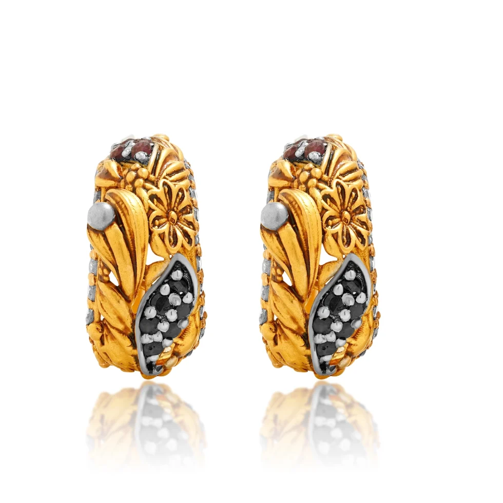 The Golden Flora Earrings capture the essence of vintage opulence through intricate floral engravings and gemstone detailing. Crafted in radiant gold with accents of black and white stones, they reflect a harmonious blend of tradition and modern artistry.