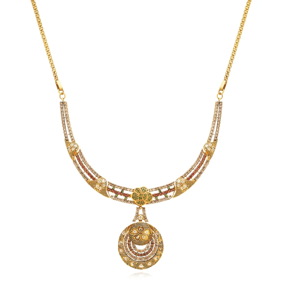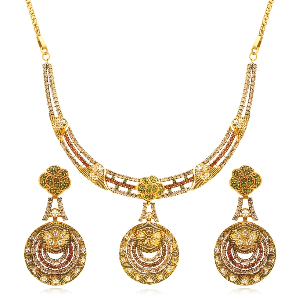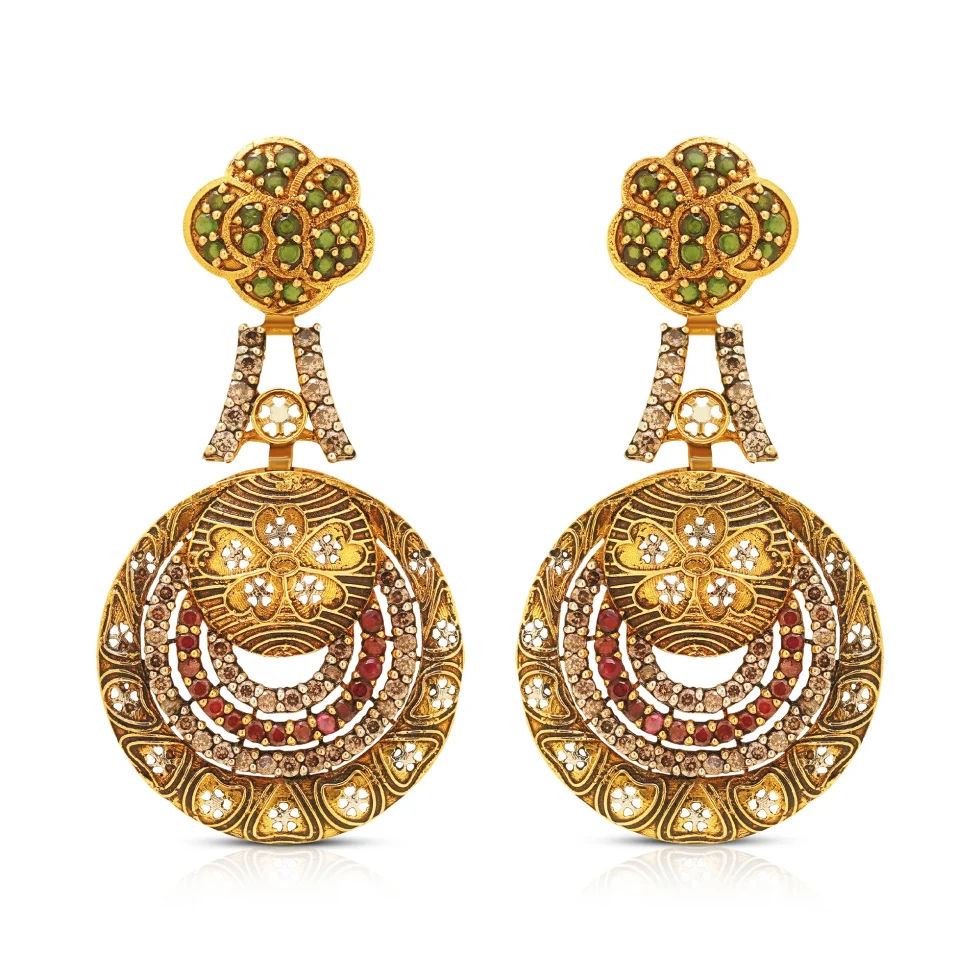 Delicate floral motifs and rich gold textures are enhanced with soft hints of green and maroon, adding depth and vibrance. The graceful circular drops give the design a timeless ceremonial charm.