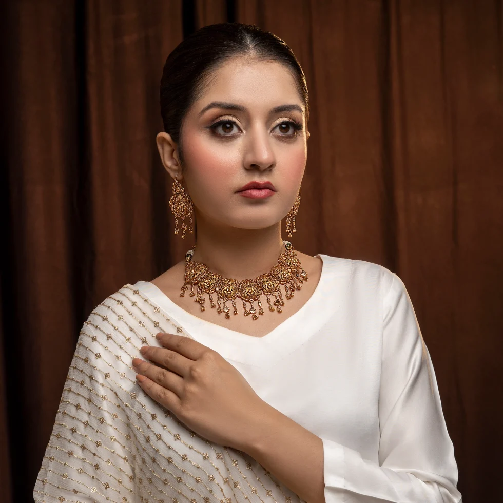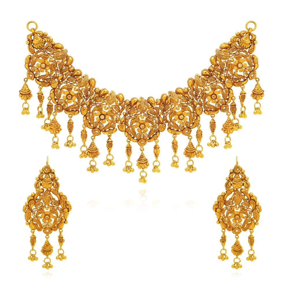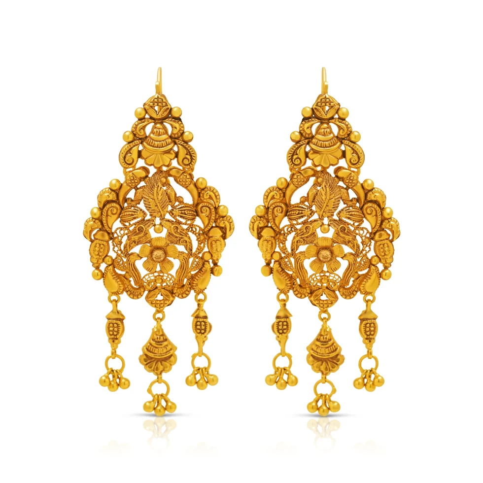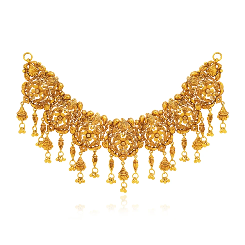 Richly carved petals, leaves, and traditional motifs intertwine to create a masterpiece of cultural artistry. The dangling elements elevate its grandeur, making it a stunning choice for bridal and festive celebrations.