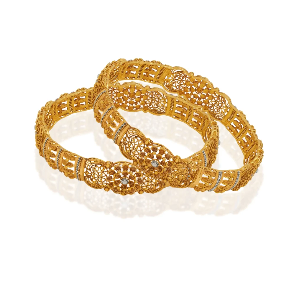 Rich in craftsmanship, these karas showcase ornate floral clusters framed by geometric panels. The detailed artistry and subtle white highlights add a regal touch, making them an elegant heirloom piece.