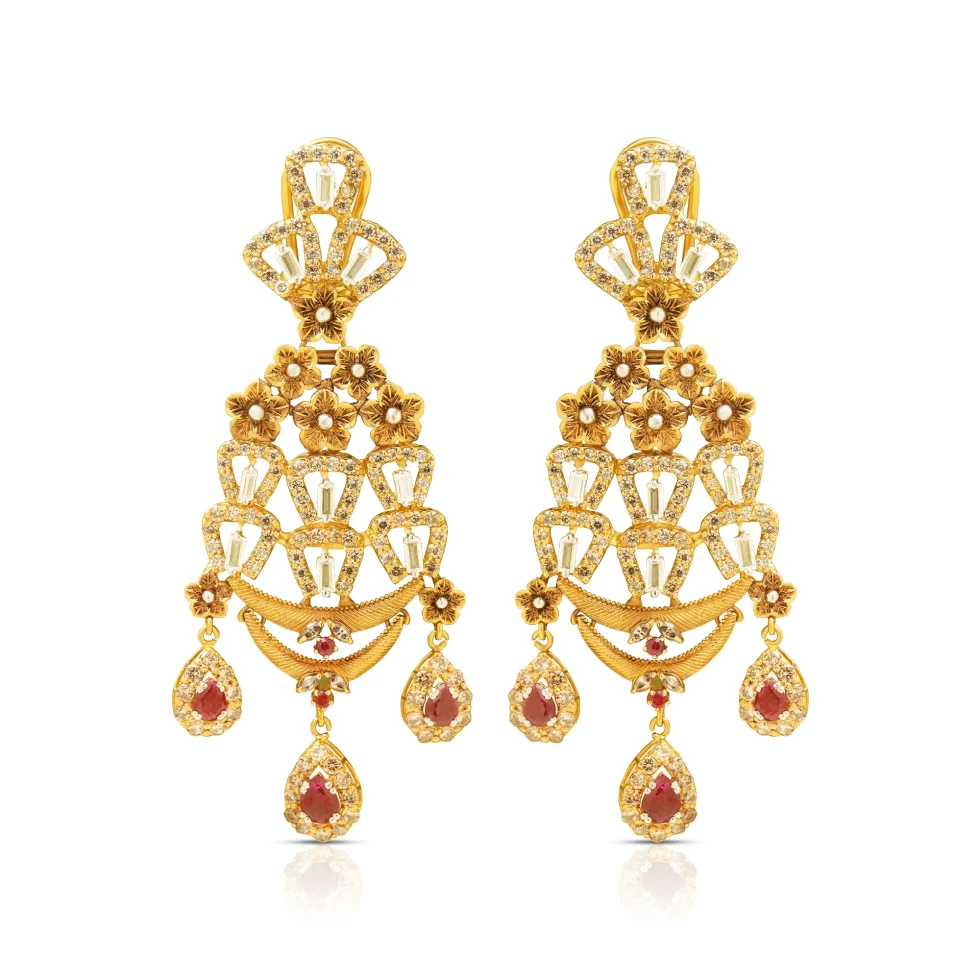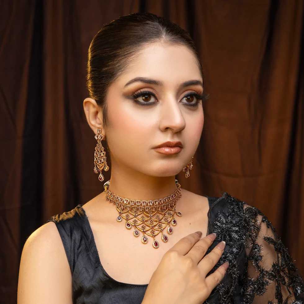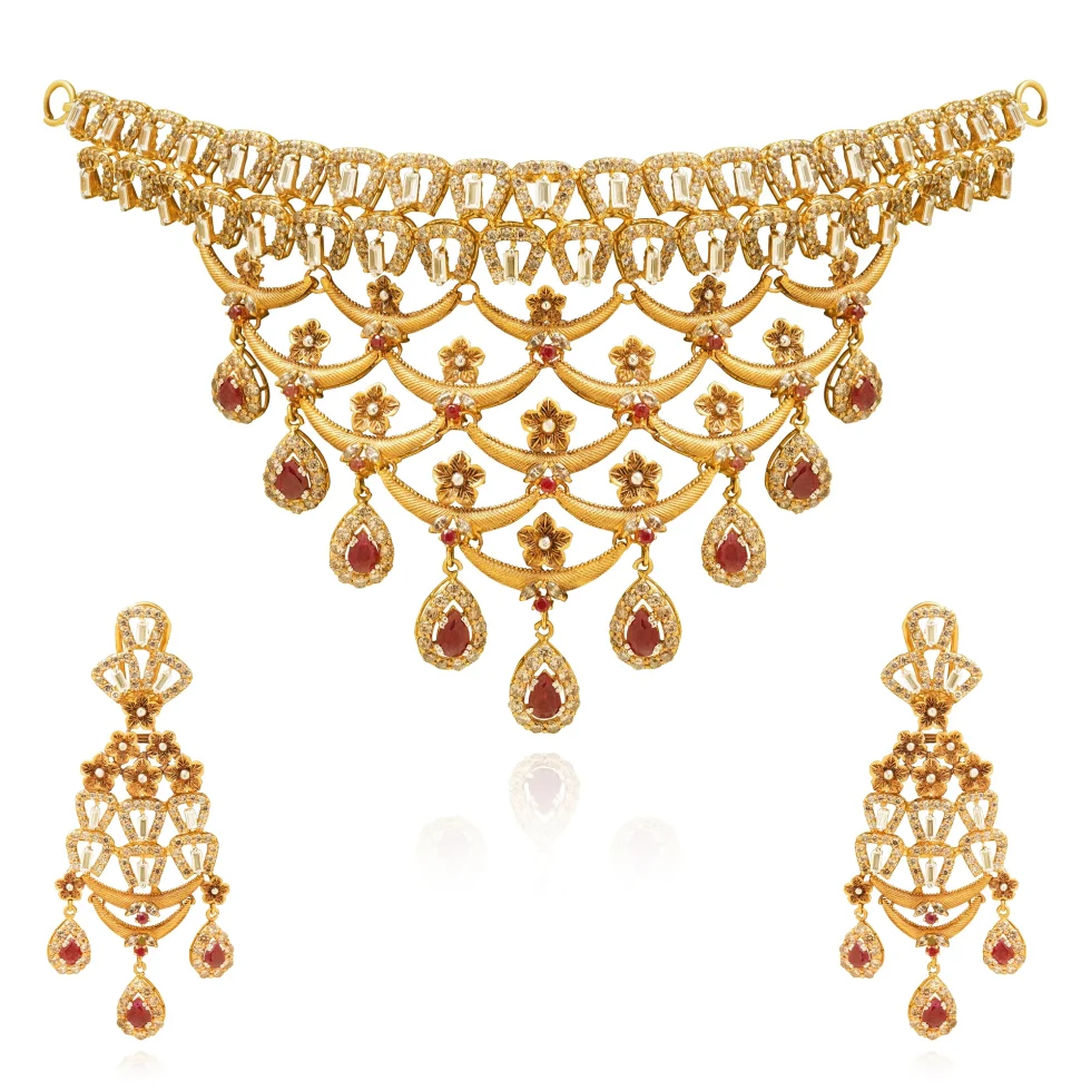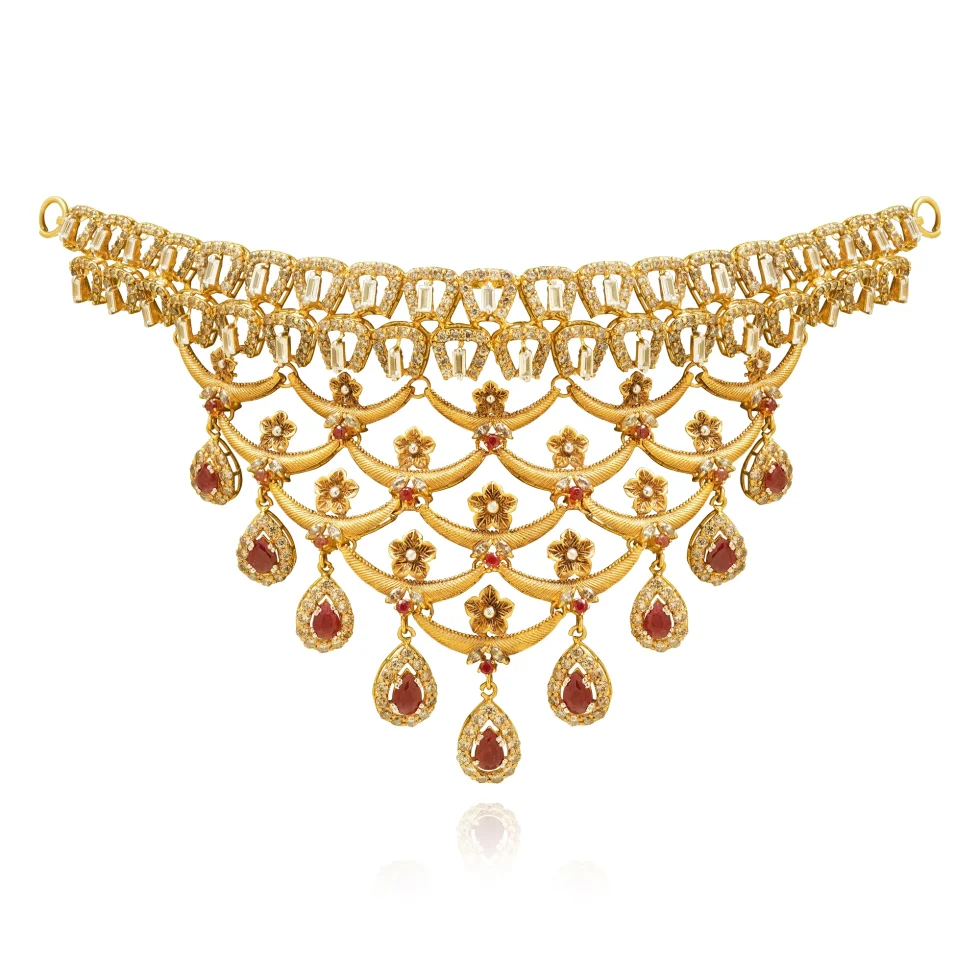 The Imperial Veil Set captures the grace of ancient royalty through cascading golden arcs and delicately sculpted floral motifs. Each layer drapes like a royal veil, adorned with ruby droplets that shimmer with timeless allure. A masterpiece of balance and rhythm, it represents elegance in motion created for the bride who radiates both grandeur and grace.