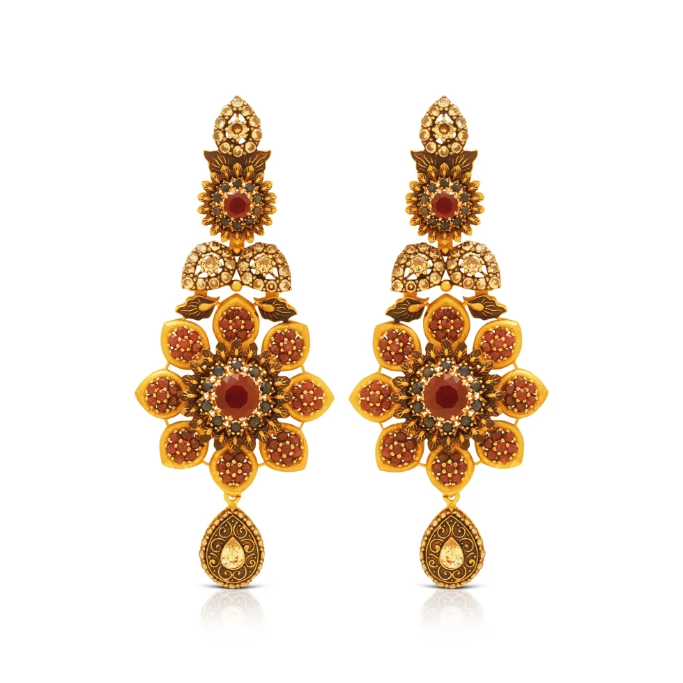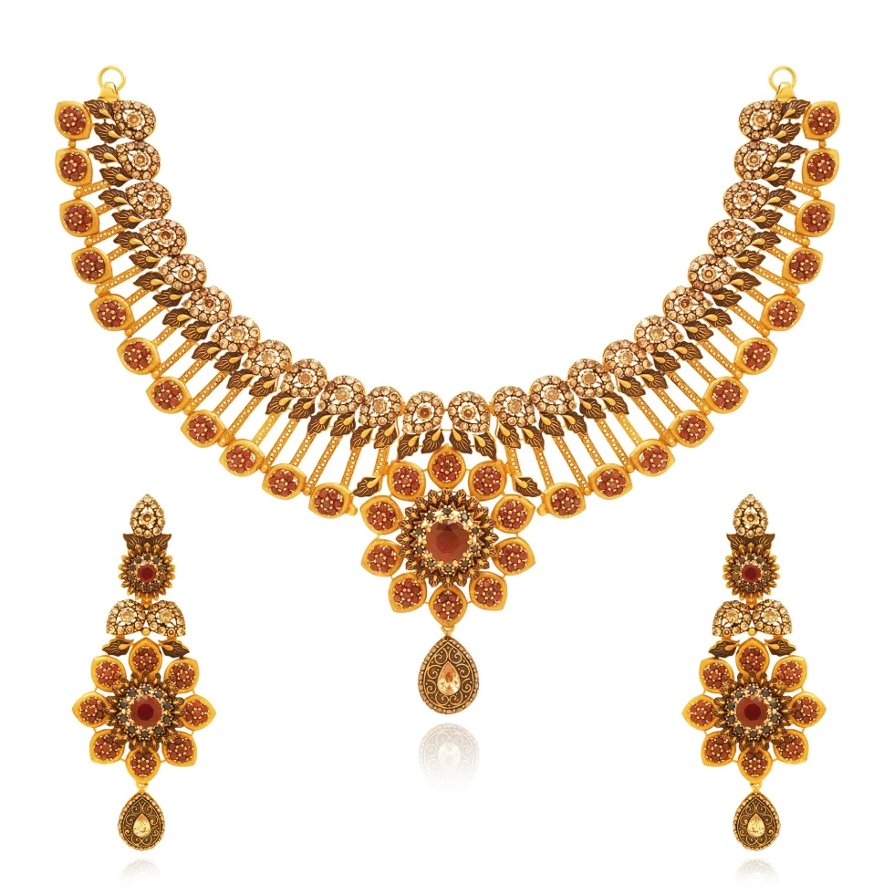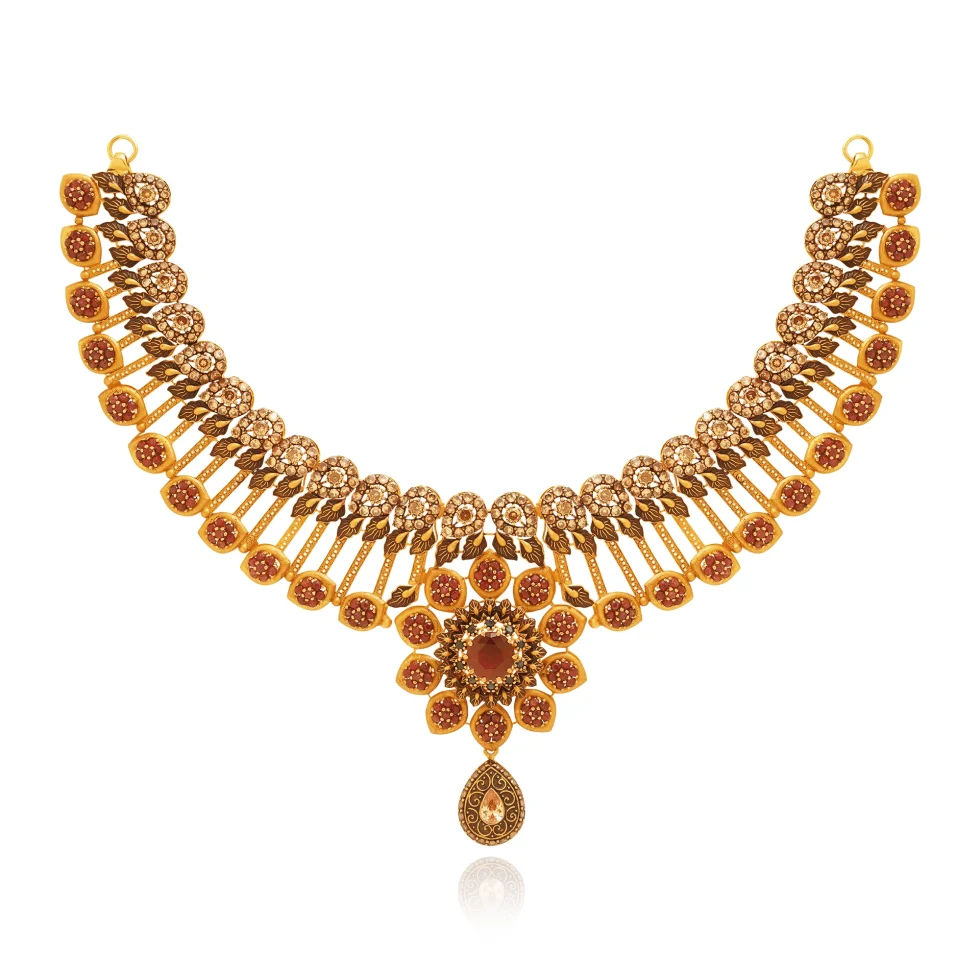 Inspired by the richness of traditional marigold garlands, this piece features patterned petals, ornate textures, and deep red centers. The structured neckline and statement pendant bring together elegance, harmony, and ceremonial grandeur.