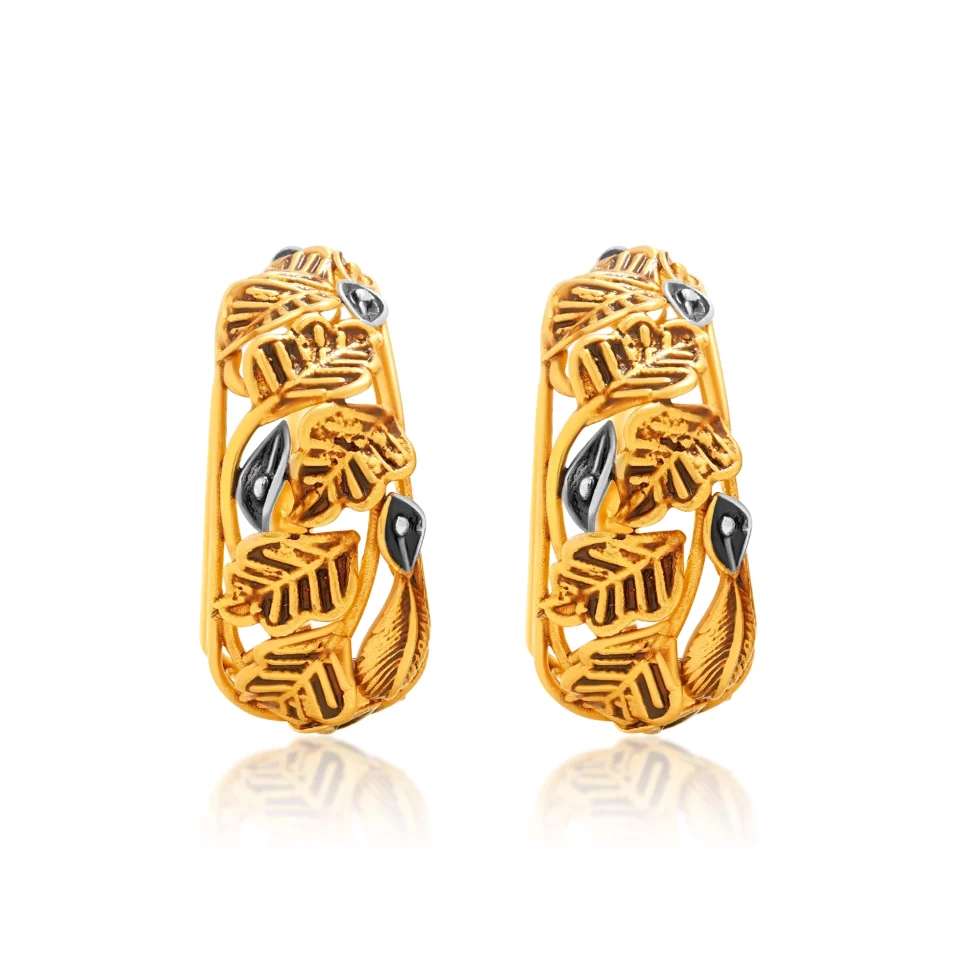 The Noir Leaf Earrings blend nature’s elegance with artistic craftsmanship. Designed in radiant gold, they feature delicately carved leaf motifs accentuated by glossy black enamel details. The intricate openwork design adds lightness and texture, creating a perfect balance of grace and sophistication.