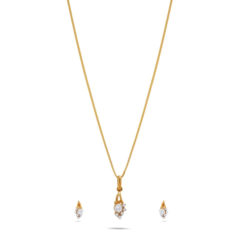The Nova Grace Set embodies the essence of effortless elegance. Crafted in fine gold, its fluid pendant design flows gracefully, leading the eye to a cluster of luminous stones that shimmer with quiet brilliance. Each curve reflects balance and poise, while the light-catching stones add a touch of modern glamour.