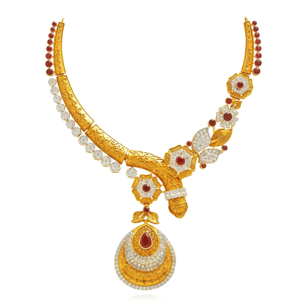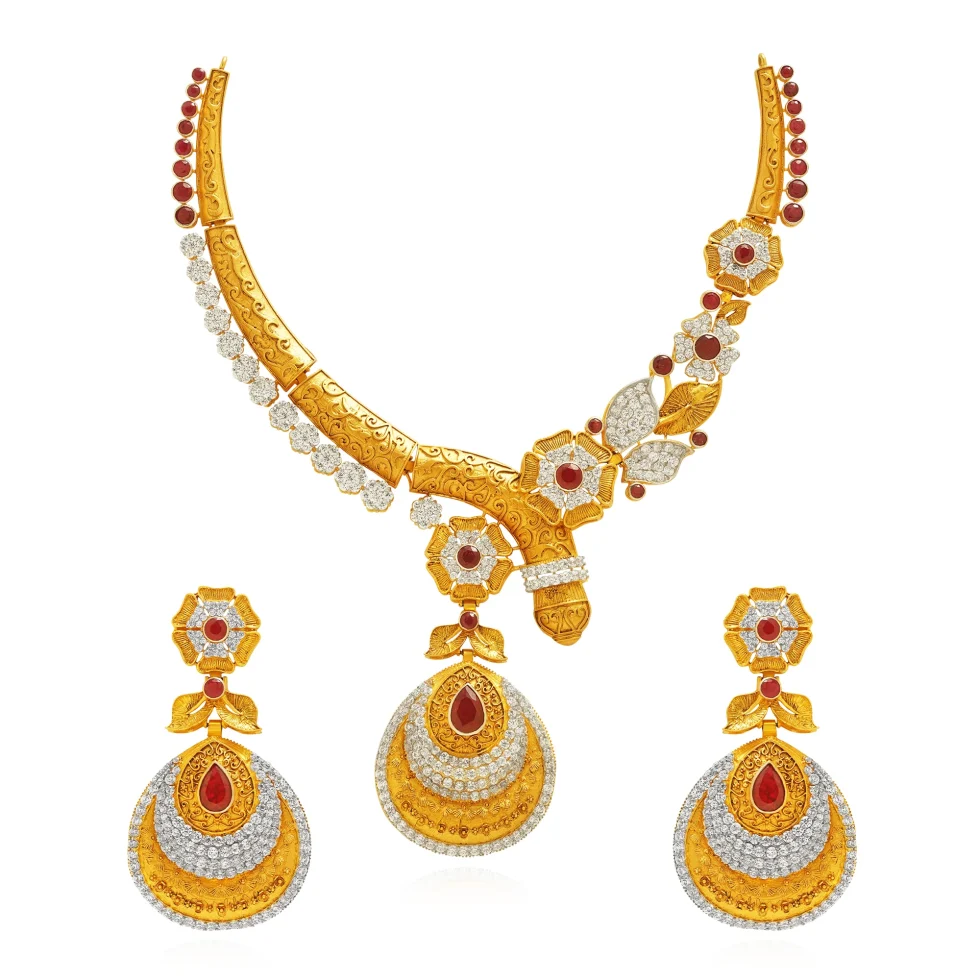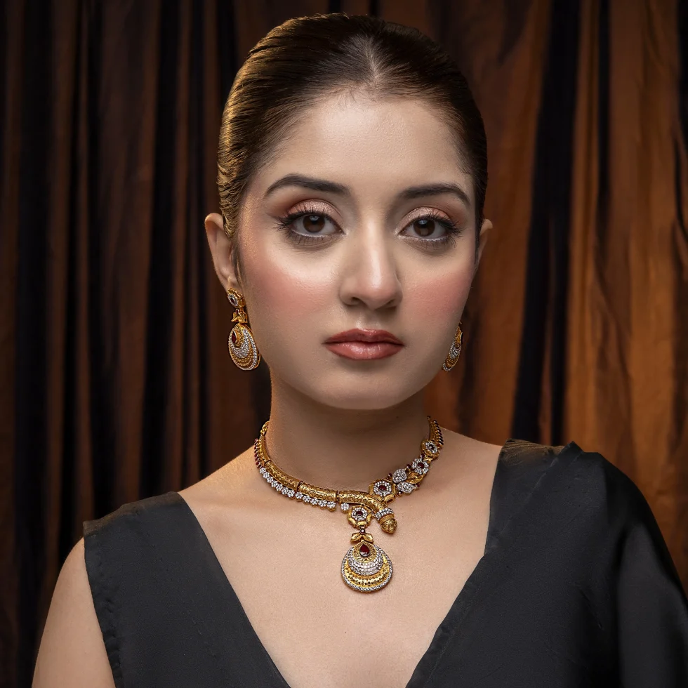 Igniting the spirit of heritage, the Regal Ember Set combines molten gold tones with the fiery beauty of rubies. The layered crescent motif and handcrafted detailing reflect a legacy of artistry perfect for those who command elegance with grace.