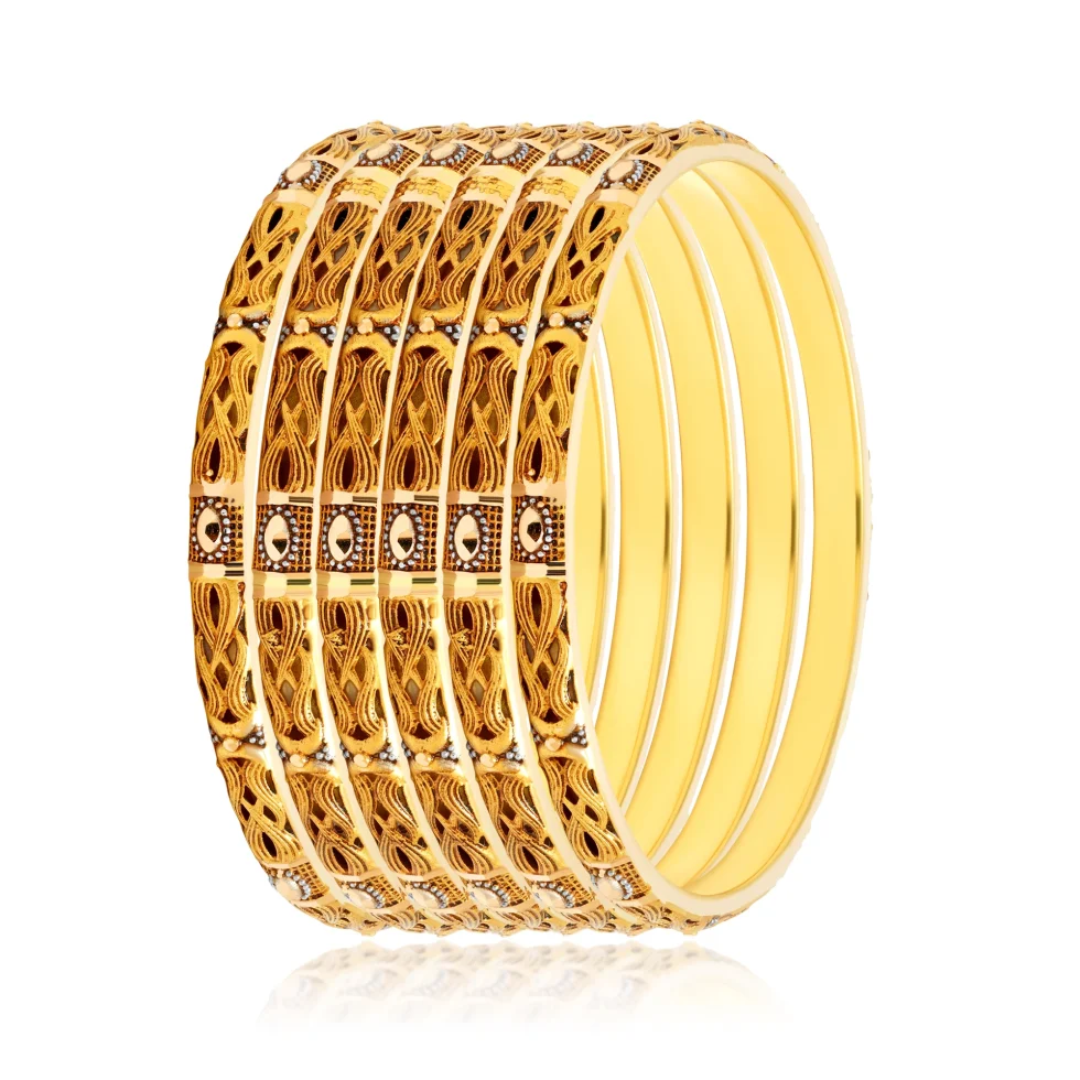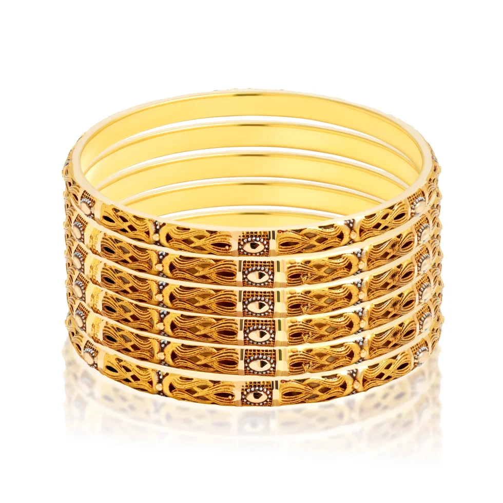 The Regal Knot Bangles embody the eternal bond of unity and grace, reflected through their intricately interlaced design. Each curve and pattern is a testament to masterful craftsmanship where traditional artistry meets contemporary finesse.