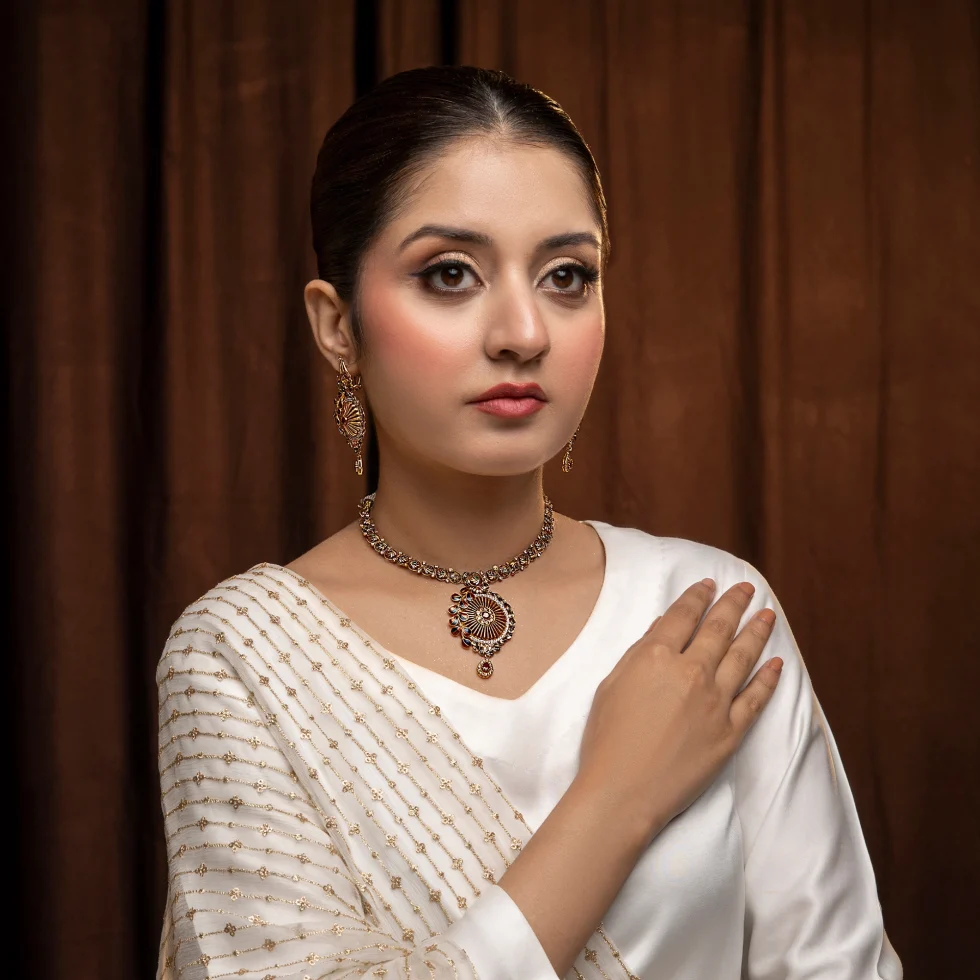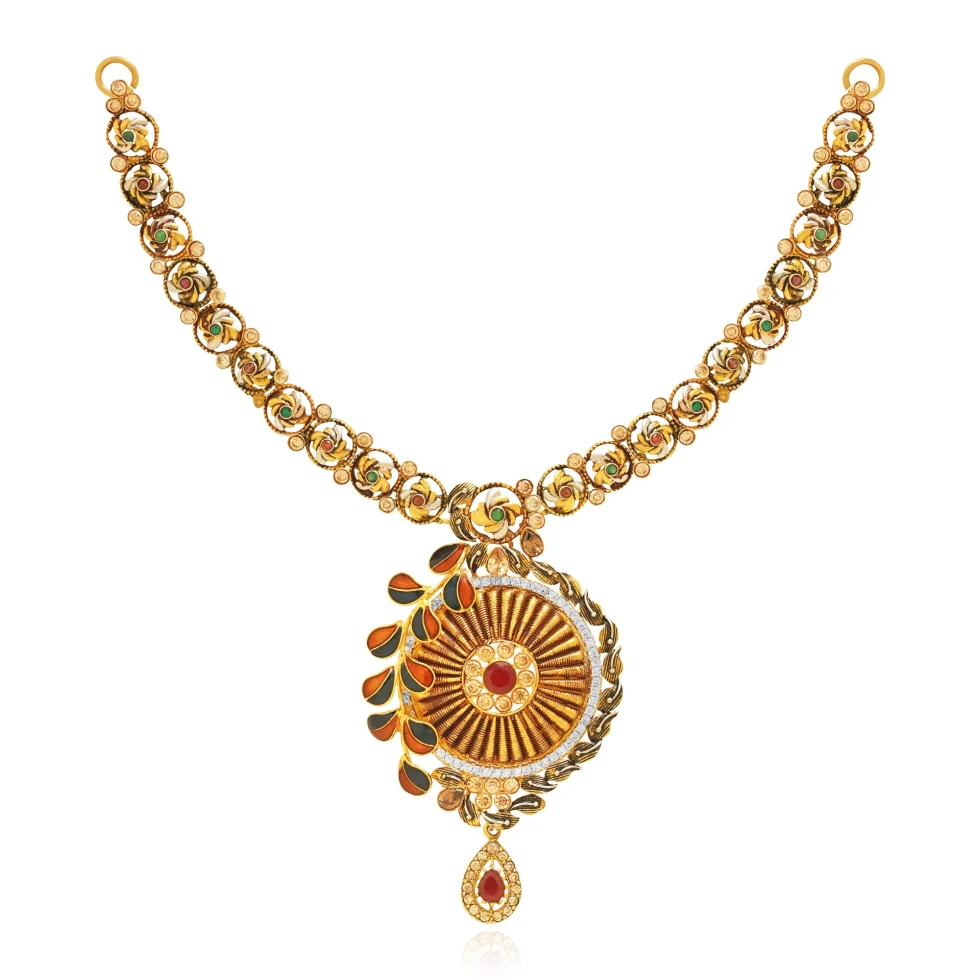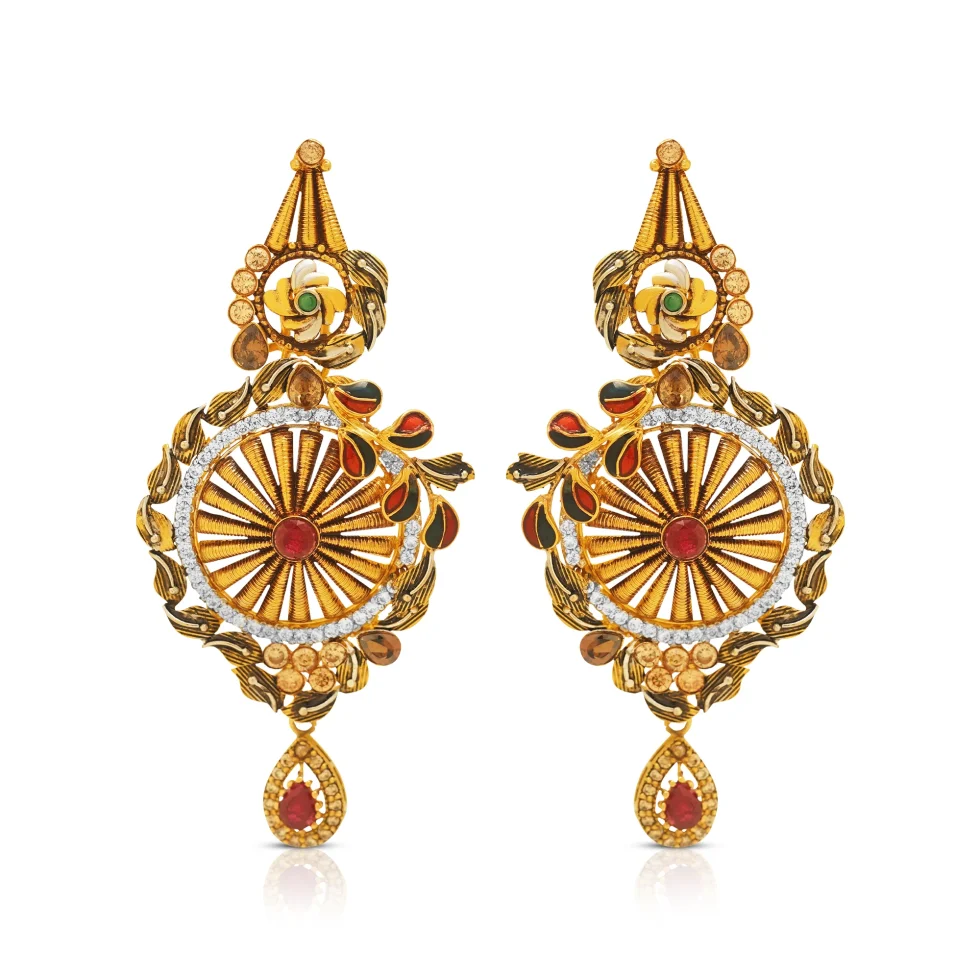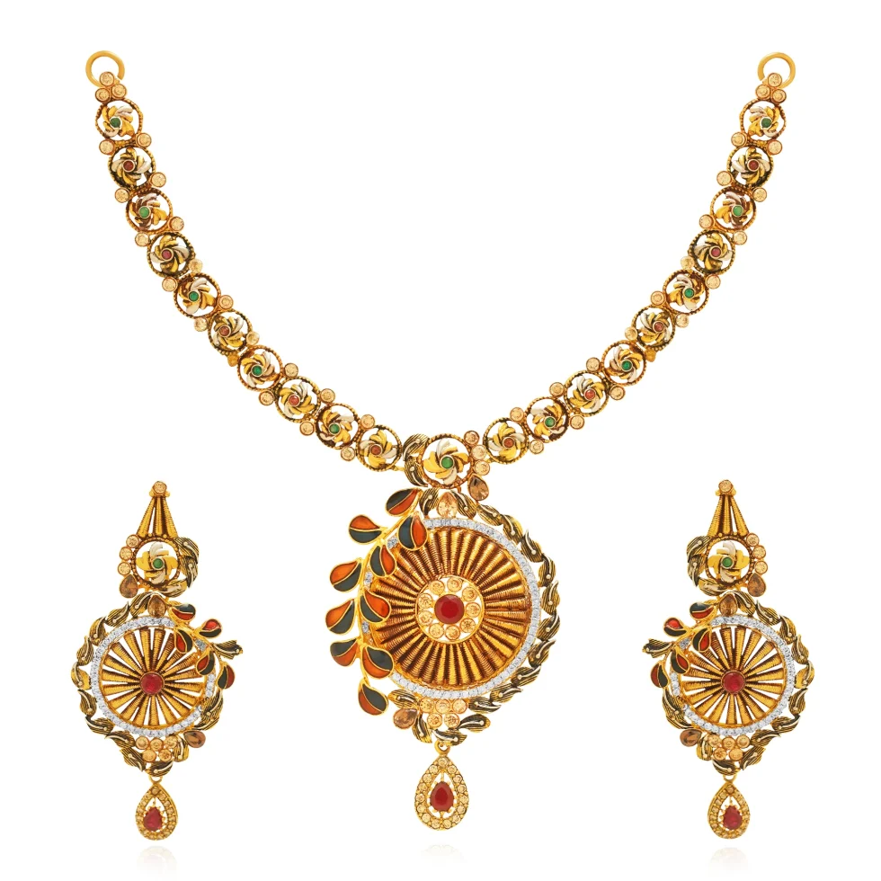Embodying the energy of sunlight and the finesse of classic goldwork, this set features a prominent medallion surrounded by artistic enamel strokes. The ruby-toned drops complete the look with a touch of regal charm.