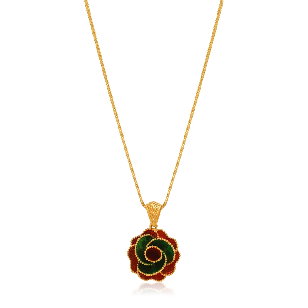 The Rosalia Bloom Pendant captures the timeless charm of a blooming rose. Crafted in gleaming gold, its petals unfold in deep green and rich crimson enamel, symbolizing love, vitality, and grace. The fine gold beading around each petal adds a touch of regal artistry, making it a perfect fusion of tradition and elegance.