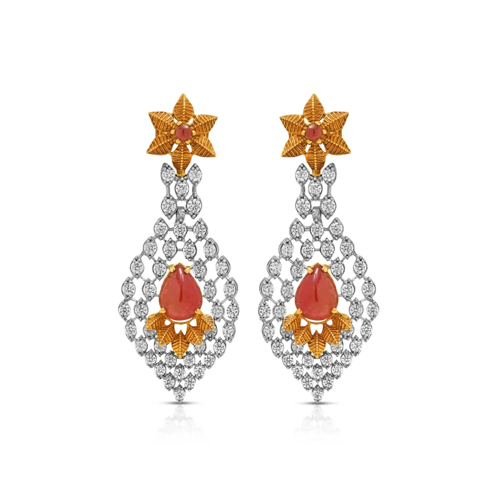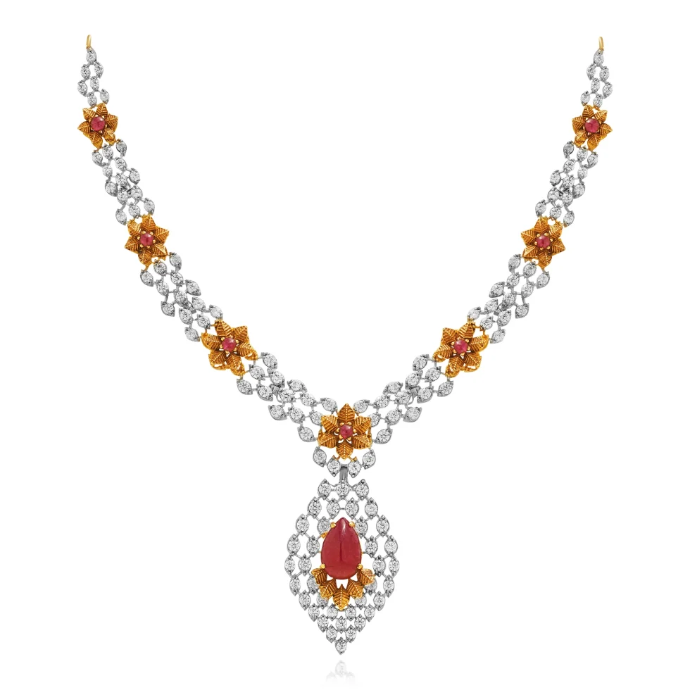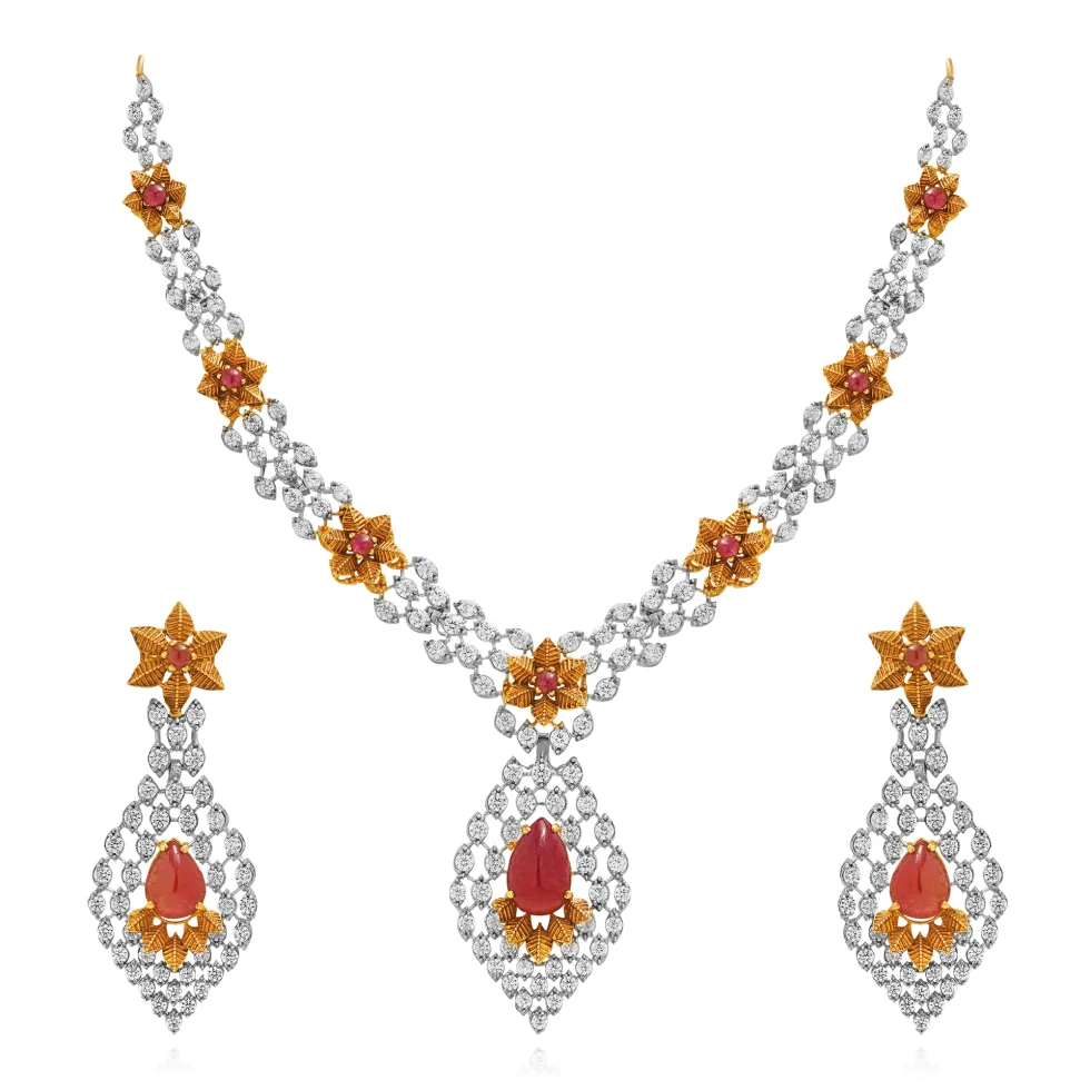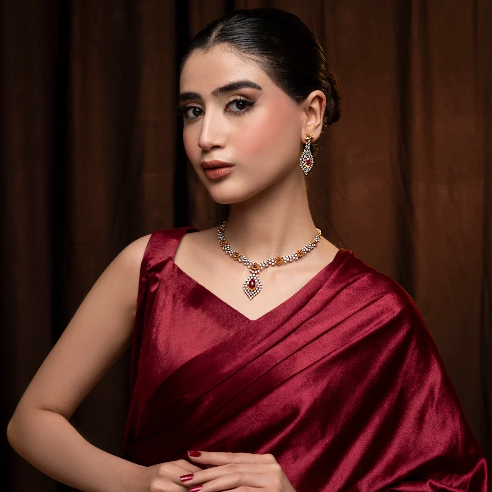 Inspired by blooming roselle flowers, this set showcases ruby-hued stones framed in a meticulously crafted lattice of shimmering white elements. A perfect harmony of color, craftsmanship, and celebration.