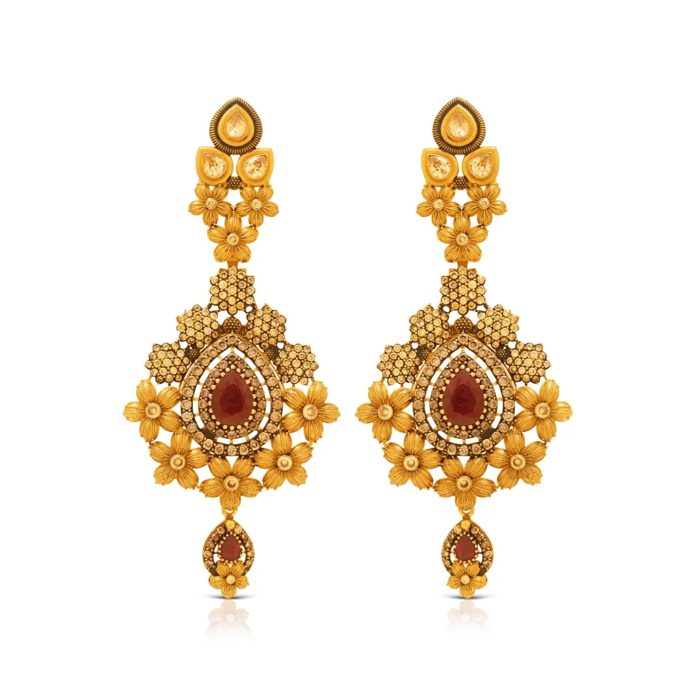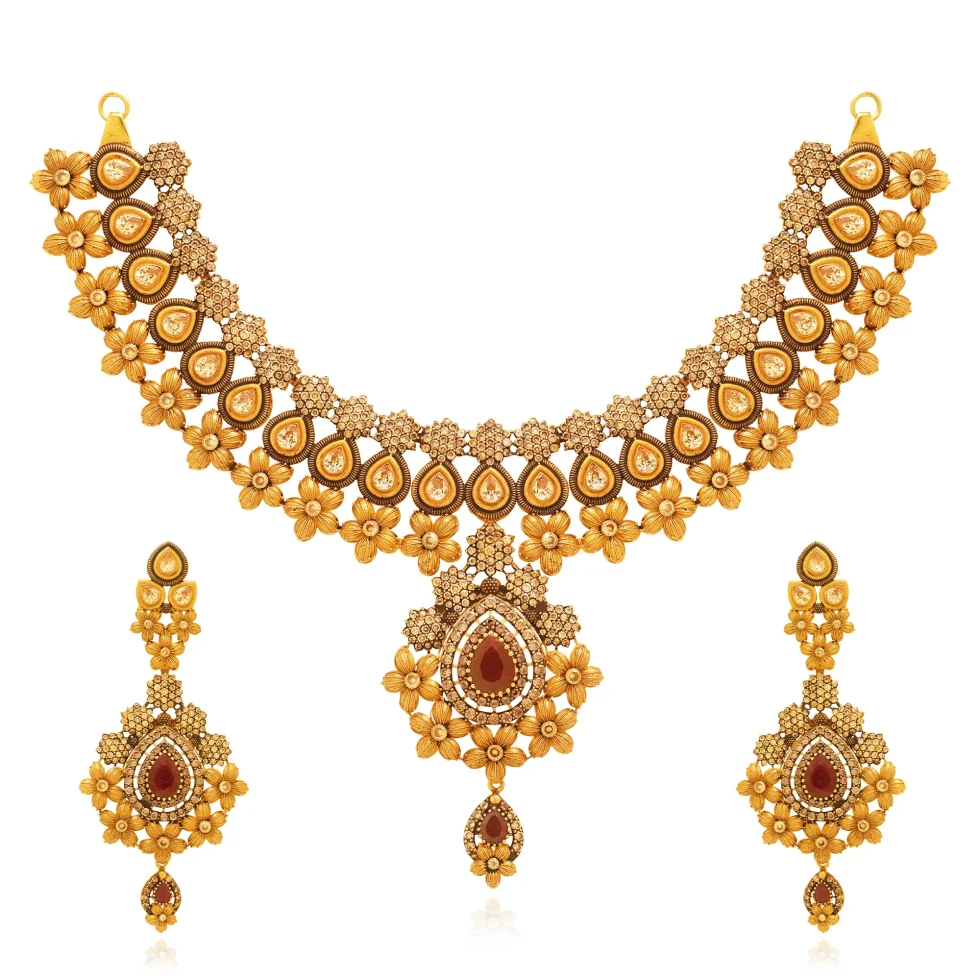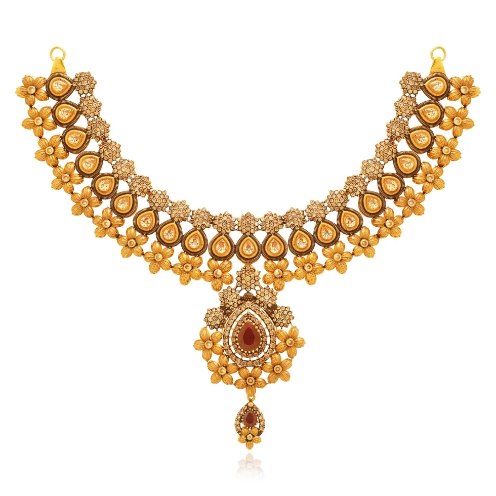 Featuring rows of pear motifs intertwined with soft floral elements, this design captures the beauty of a blooming garden in gold. Each petal, curve, and clustered detail is sculpted with exceptional precision, creating a graceful rhythm across the neckline. The grand layered pendant draws attention with its deep, warm center and intricate framing, adding depth and ceremonial richness.