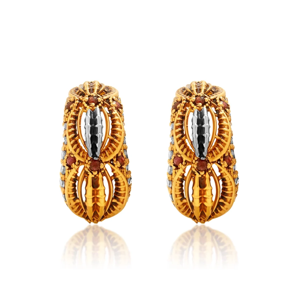 The Venera Gold Earrings are a portrait of divine craftsmanship. Their sculpted form and radiant mix of gold, silver, and red accents bring together the spirit of heritage and the charm of contemporary luxury.