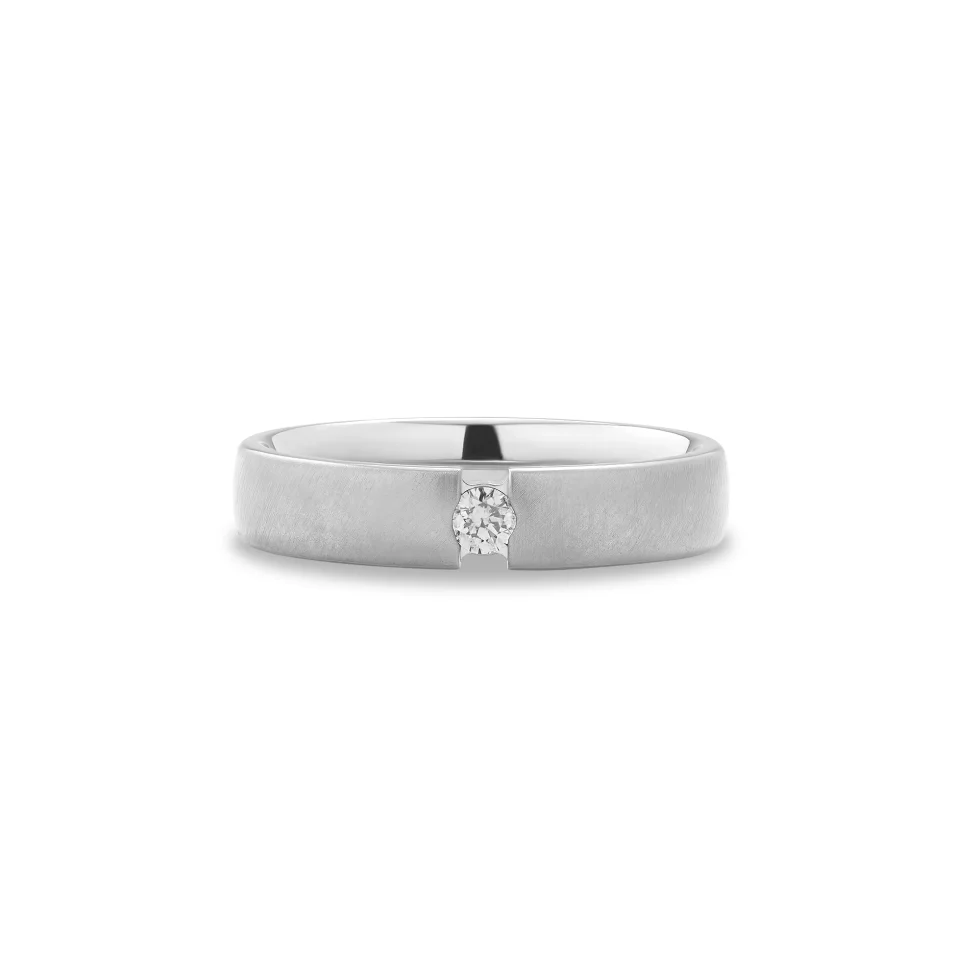 A precision-cut titanium band featuring a suspended diamond at its core. The matte exterior and polished interior create a refined contrast, bringing modern engineering and elegance together in one sleek form.