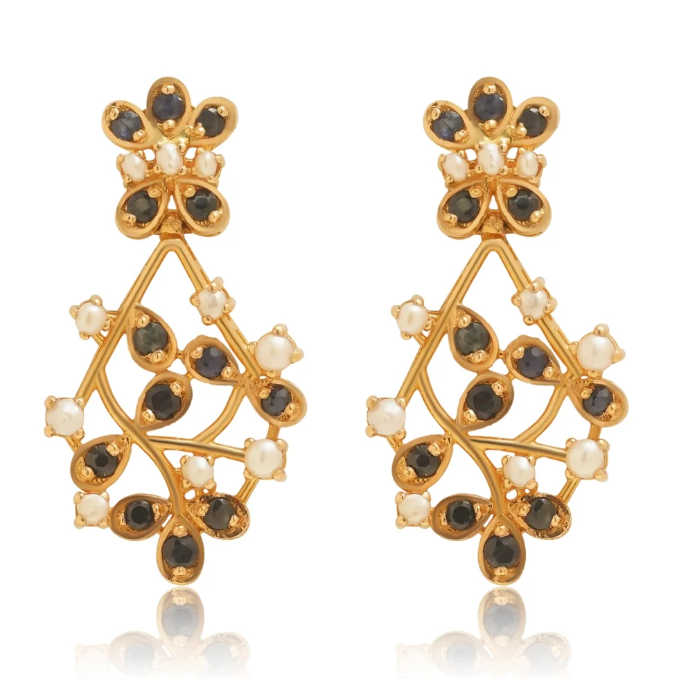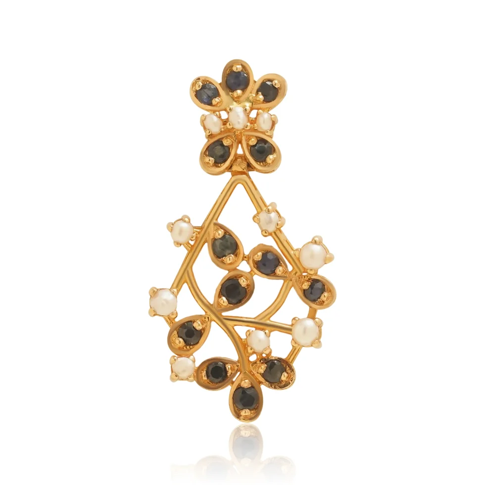 Inspired by evening florals, this design features a blend of shimmering noir stones and luminous pearls on a golden stem. A beautifully structured piece with timeless appeal.