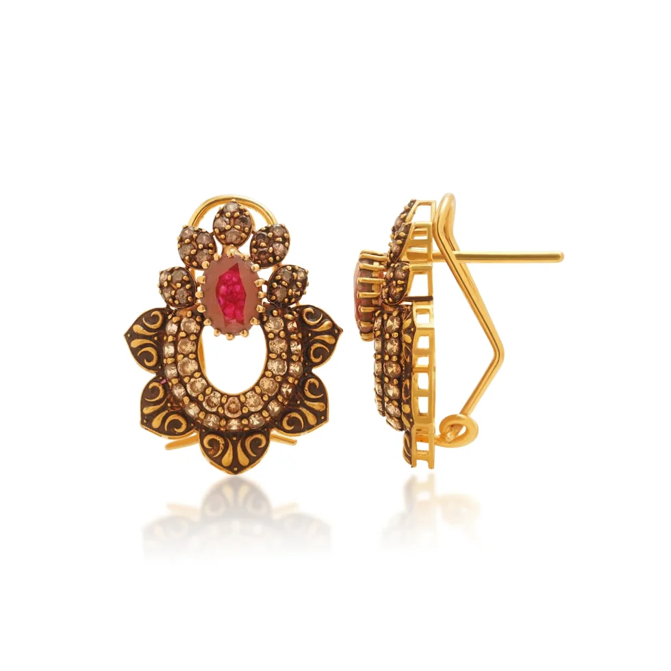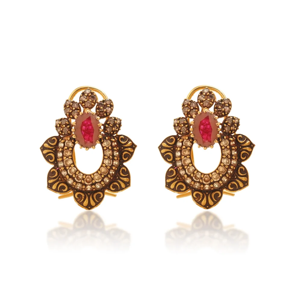 Shimmering gold granulation surrounds the central ruby, flowing into an ornate floral outline. The combination of deep colour and sculpted detailing creates a bold yet graceful traditional look.