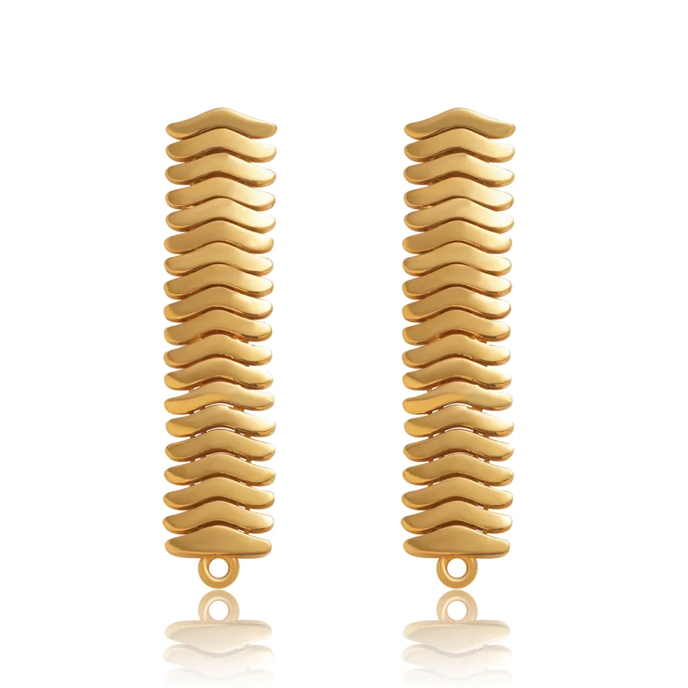Crafted from a continuous rhythm of wave-shaped gold segments, these elongated tops create a harmonious blend of movement and structure. Their smooth, reflective surface adds a subtle radiance, while the vertical form brings a sleek, modern edge.